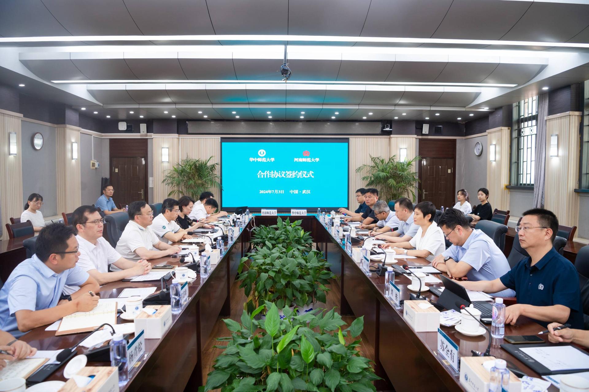 夏立新代表学校向冯淑霞一行来访表示欢迎,围绕“历史悠久”“国家重点建设”“教师教育”“信息化”四个关键词,介绍了我校的发展历程和办学特色。他表示,华中师范大学和河南师范大学两所高校同属师范大学,共同承担着教师教育的使命与职责。长期以来两校交往密切,合作基础深厚。希望以本次签署合作协议为契机,进一步拓展合作领域,固化合作成果,把双方的学科专业优势转化为立德树人的成效,在加快建设教育强国的新征程上,相互赋能,共同推动两校事业高质量发展,为构建中国特色高质量教师教育体系作出新的更大的贡献。