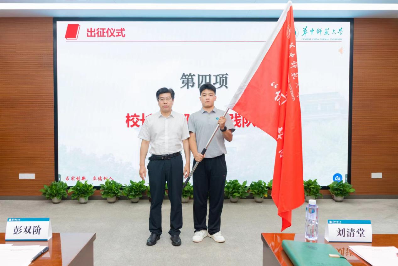 彭双阶为实践队授旗,寄语实践队全体成员,要勤学善思,坚定扎根基层之心,虚心向一线老师学习,提升能力,坚定理想;要脚踏实地,躬行教育实践之路,在教育实践中破解学不为用、学不会用、学不敢用的学用之困;要团结协作,汲取个人奋进之力,在学习中共同成长,共同进步;要恪守纪律,强化自我管理意识,牢记“安全第一”的原则,尊重当地民风民俗,展现华师学子的良好风貌。