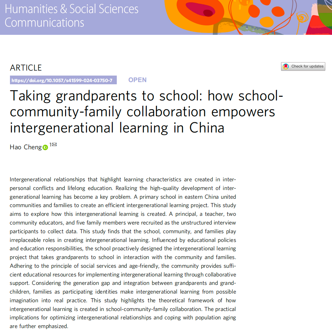 华大在线讯(通讯员 刘馨雨)近日,教育学院“主体教育理论创新研究团队”再取阶段性研究进展,相关成果“Taking grandparents to school: how school-community-family collaboration empowers intergenerational learning in China”在Nature子刊Humanities & Social Sciences Communications发表。教育学院教育学系程豪博士为独立作者。该研究得到“国家资助博士后研究人员计划”的支持。