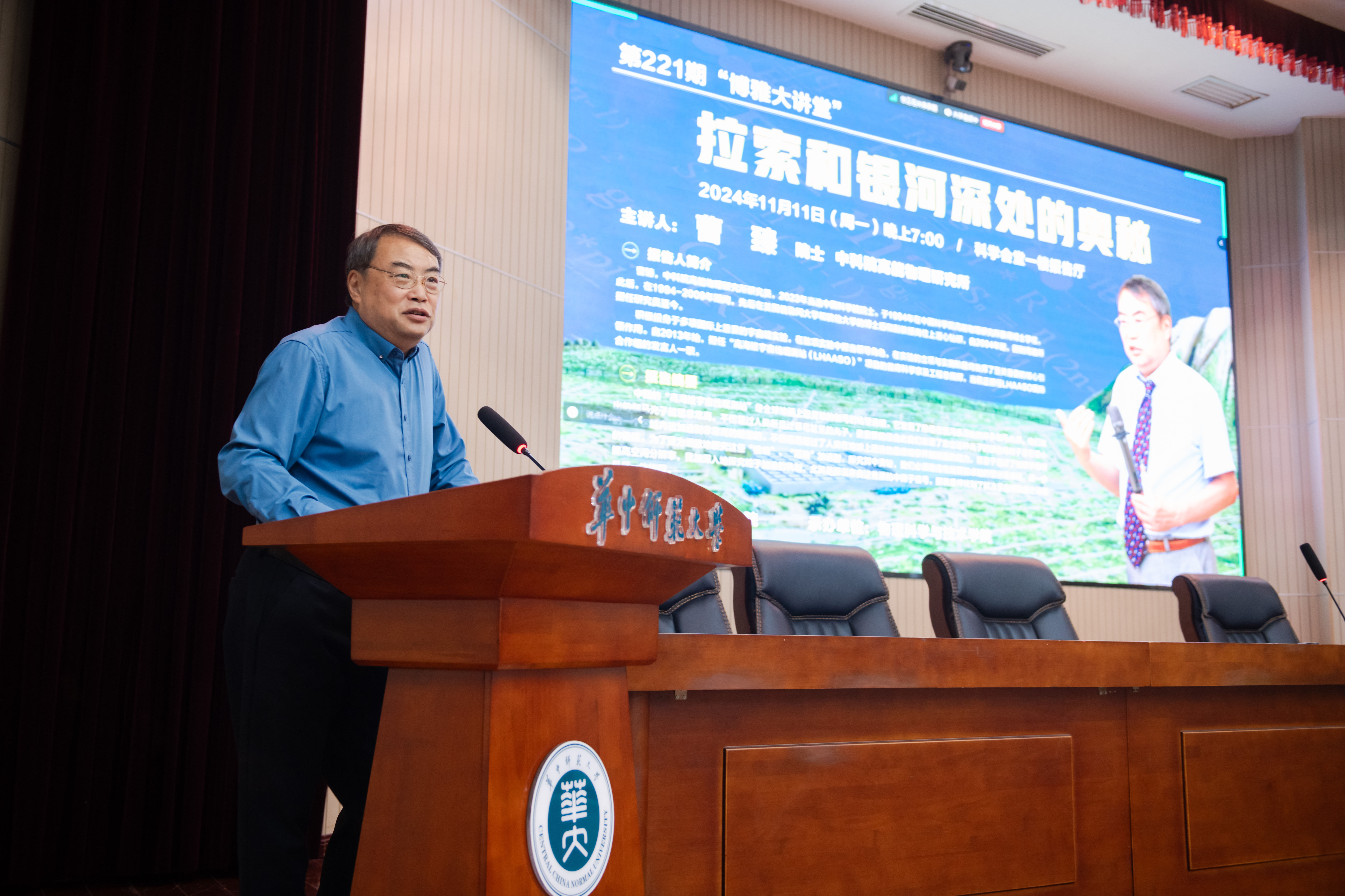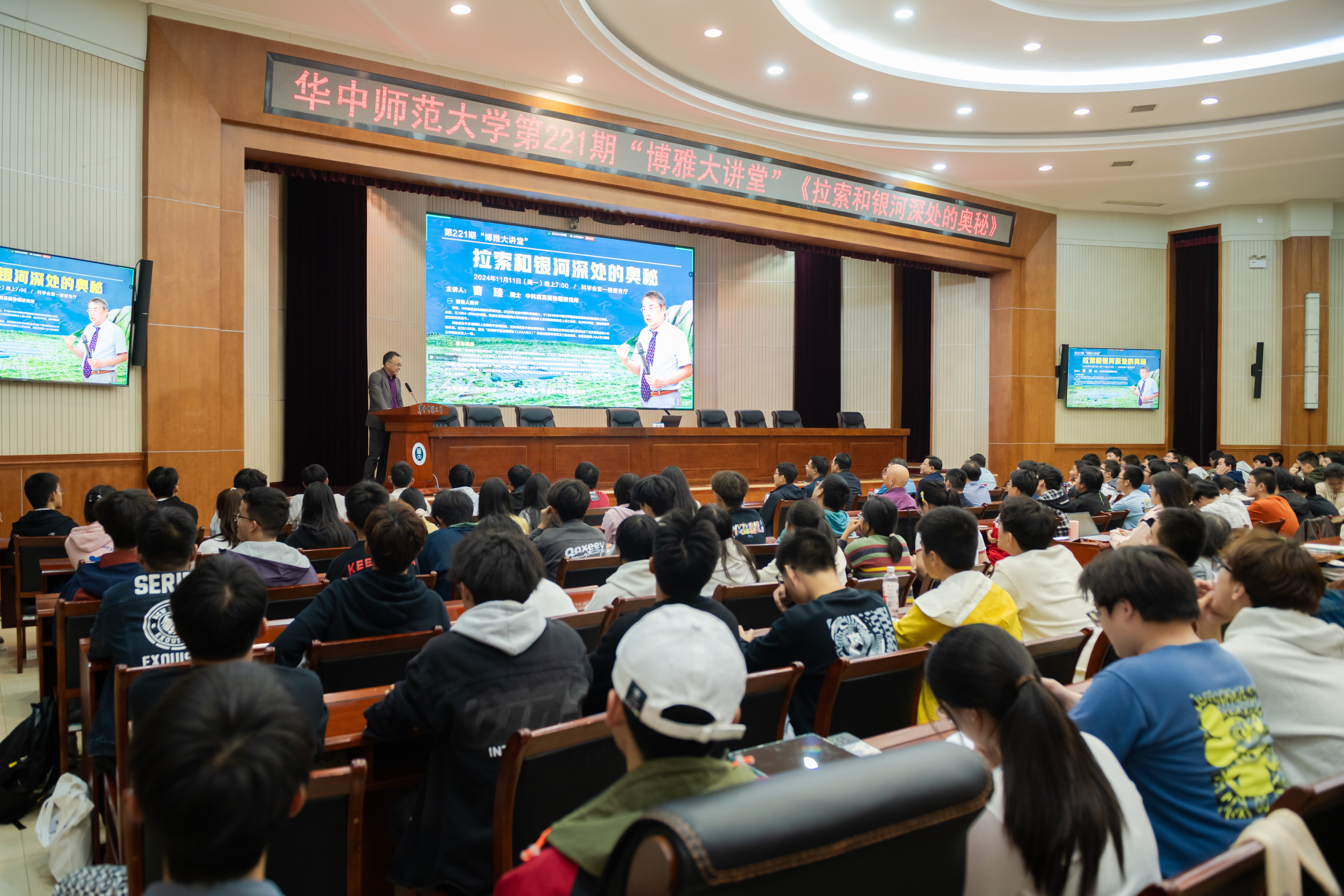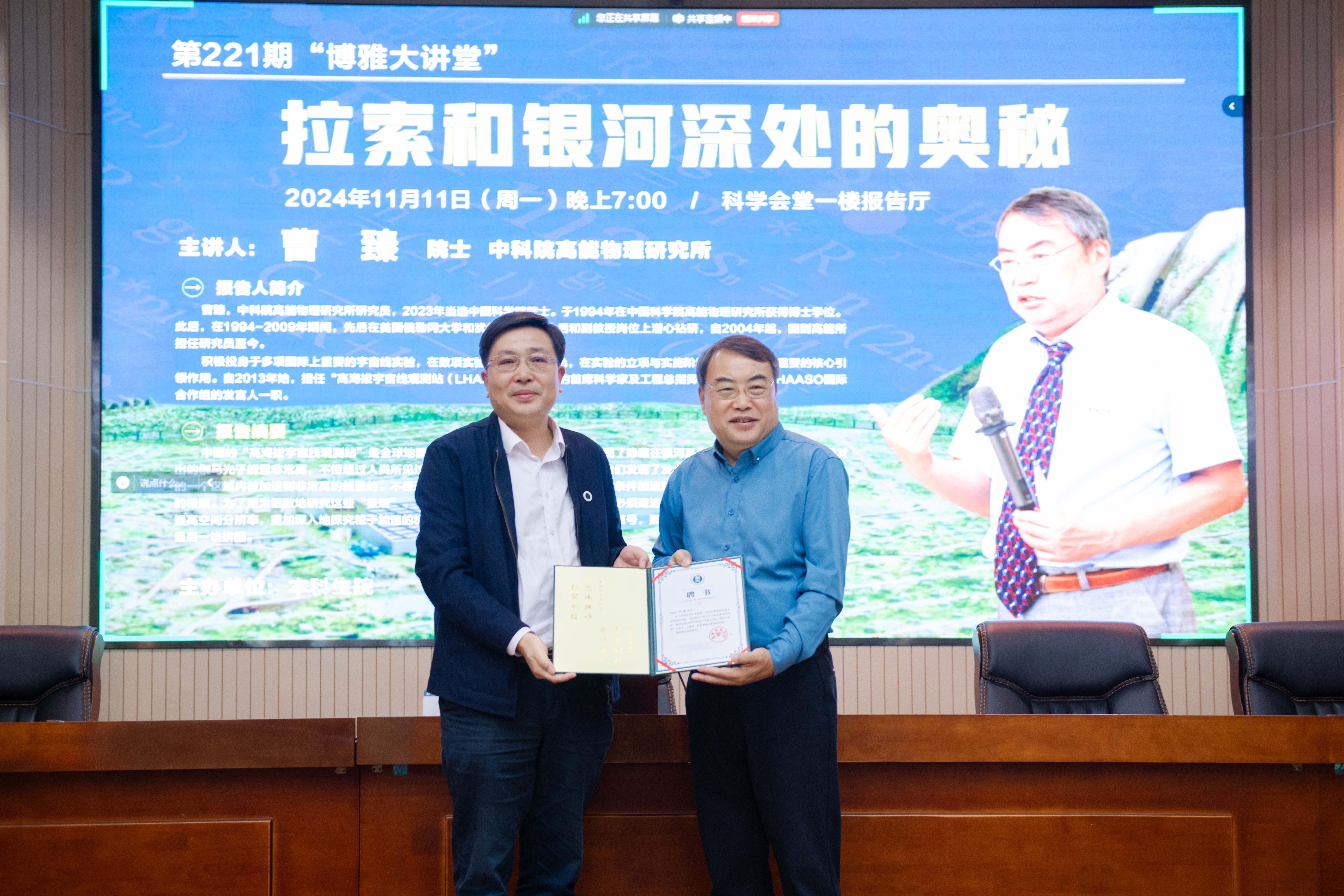 华大在线讯(通讯员 祝紫梦 贾一翀)11月11日,中国科学院院士、中国科学院高能物理研究所研究员、“拉索”首席科学家曹臻院士作客华中师范大学第221期“博雅大讲堂”,在科学会堂一楼报告厅为我校师生带来“拉索和银河深处的奥秘”专题讲座。副校长刘宏达出席报告会并为曹臻院士颁发“博雅大讲堂”主讲人聘书。