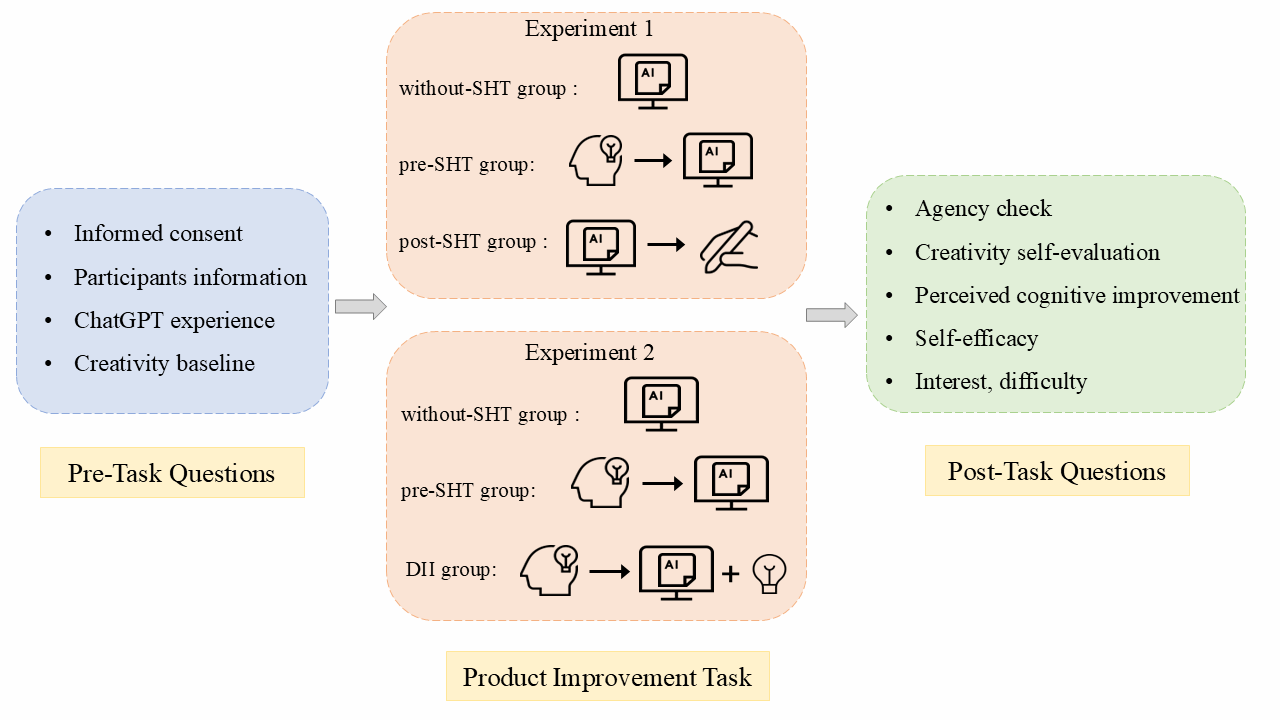 随着生成式AI的发布和不断迭代,其在创造领域展现出强大能力,如何利用AI突破思维边界并提高学生创造力已成为当前研究的热点。根据分布式认知理论,人类的认知不仅限于个体的身心内部,可以扩展至他人、其他智能体甚至环境中其他事物(如书本等工具),认知的扩展能大幅提升整体的认知水平和思维能力。先前研究发现,人-AI协同能广泛提高整体的创造性表现。但是,当前的人-AI协同创造存在三大问题:一是难以产生原始的、突破性的创新;二是可能导致创意同质化;三是削弱甚至剥夺人的独立思维,不利于人的创造力的提升与发展。然而,现有研究尚未提出有效的策略来优化人-AI的协作模式。