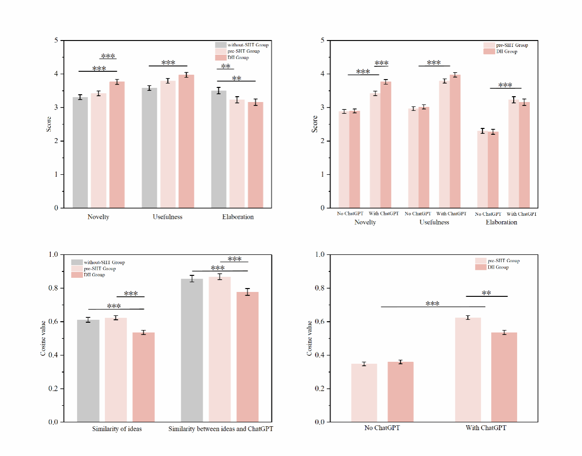 实验2进一步要求学生在协作过程中将自身事先独立生成的想法与AI生成内容深度整合,以确保人类主体性的持续。结果表明,深度整合组的提问质量得到了持续性提升,并驱动了最终方案创意的显著提升。同时,学生个性化的想法也导致了彼此间方案相似性的显著下降。