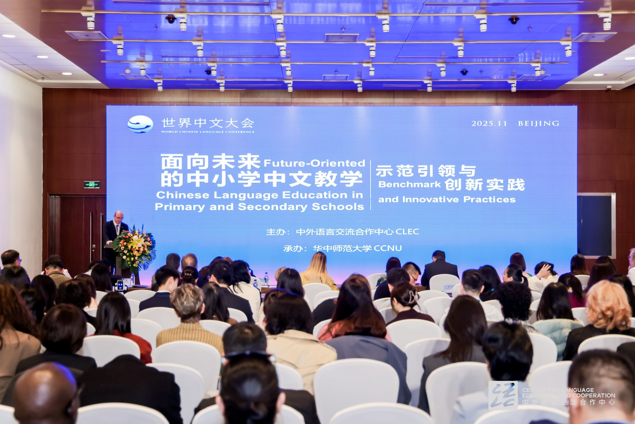 华大在线讯(通讯员 左双菊 李敏琳)11月14日至16日,2025世界中文大会在国家会议中心举行。会议期间,由教育部中外语言交流合作中心(以下简称“语合中心”)主办,我校承办的“面向未来的中小学中文教学:示范引领与创新实践”平行论坛,吸引来自美国、英国、法国、意大利、葡萄牙、俄罗斯、匈牙利、新加坡、泰国、伊朗等国的大学校长、中文教育专家、政府机构负责人及国际中文教师代表参会。会议围绕“外语教学政策支持下的中文教学”“数智化技术在中文教学中的应用和展望”两大议题展开深入研讨。
