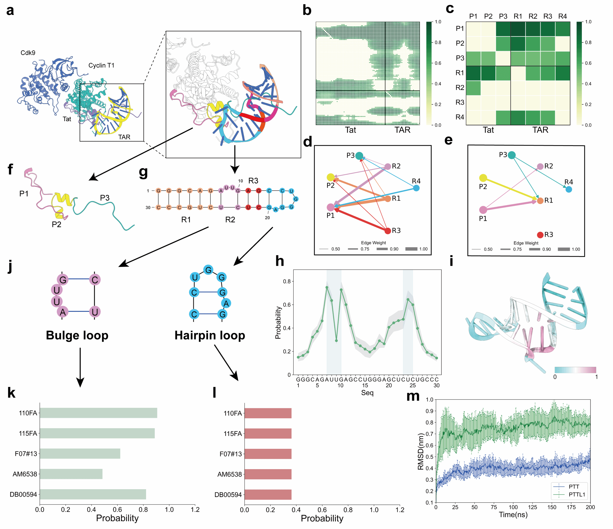 针对上述关键问题,研究团队提出物理知识引导的机器学习框架ZHMolRM。该方法基于神经关系推断从MD轨迹中挖掘潜在相互作用网络,并结合复杂网络算法RNet精确识别关键功能区域。框架进一步整合小分子抑制剂筛选模型ZHMol-RLinter,实现从机制解析到调控策略设计的贯通。该框架在P-TEFb/Tat/TAR和aaRS/tRNA体系中成功识别调控位点并筛选候选抑制剂,为RNA调控机制研究和靶向药物发现提供了新思路。