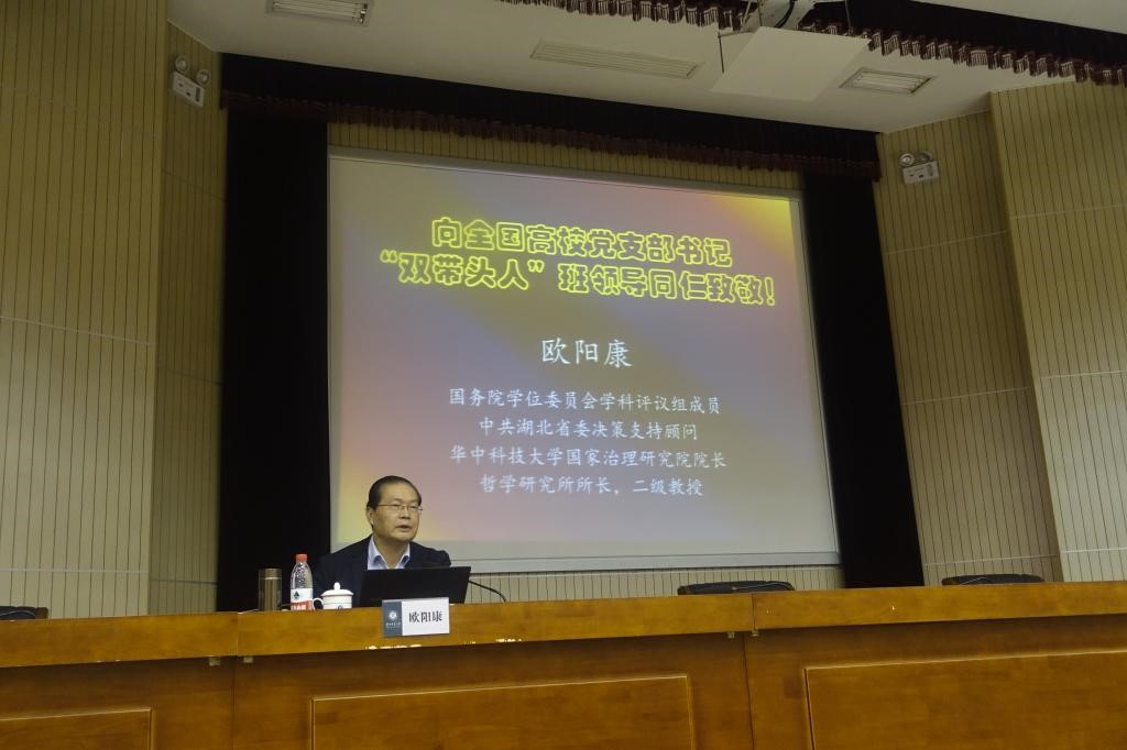 华大在线讯(通讯员 董明伟 刘瑞)11月11日,华中科技大学国家治理研究院院长、哲学研究所所长欧阳康教授为全国高校教师党支部书记“双带头人”高级研修班作了题为《马克思主义中国化的伟大飞跃——深入学习领会习近平新时代中国特色社会主义思想》的专题报告。