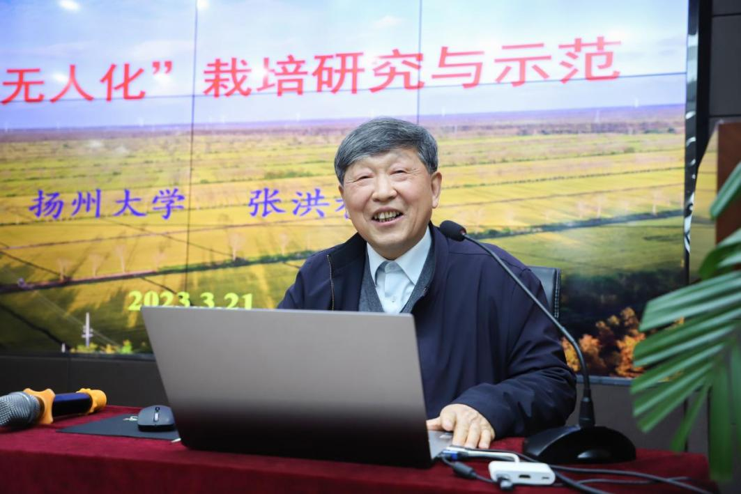 张洪程从近几十年农耕现状出发,提出现有农业生产技术不适应时代发展新需求。他带领团队以农艺机融合攻关,利用无人机牵引系统实现机械种植的无人作业,还配套研发应用除草除虫和远程灌溉技术,创立了“秸秆还田施肥整地+机插(飞播)+飞防(施肥)”和“秸秆还田耕整施肥播种开沟+飞防(施肥)”技术,实现了水稻优质丰产。讲座还着重介绍了水稻“无人化”栽培的研发进程,如创新核心技术系统、配套技术系统等。
