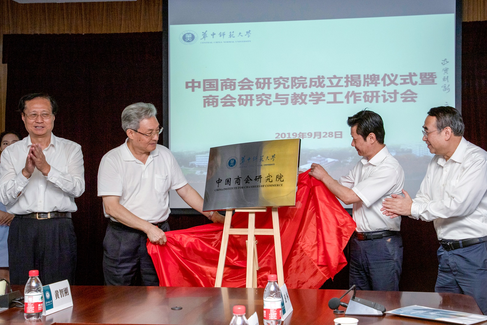 华大在线讯(见习记者 杨子寒 孙蕊 记者 彭志翔)9月28日,我校中国商会研究院成立揭牌仪式暨商会研究与教学工作研讨会在逸夫国际会议中心二楼召开。中国商会研究院名誉院长、全国工商联原常务副主席孙安民,中国商会研究院名誉院长、湖北省工商联原主席赵晓勇,校长、党委副书记赵凌云,中国商会研究院院长、我校中国近代研究所所长马敏共同为商会研究院揭牌。