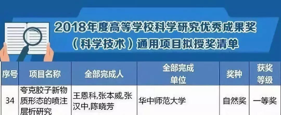 王恩科、张本威、张汉中、陈晓芳研究团队的研究成果“夸克胶子新物质形态的喷注层析研究”荣获2018年教育部高等学校科学研究优秀成果奖(科学技术)自然科学奖一等奖