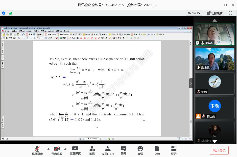 华大在线讯(通讯员 数轩)5月23日至24日,我校第五届“偏微分方程及其应用”线上学术论坛举办。国家基金委数理科学部主任江松院士、香港中文大学辛周平教授、中山大学原副校长朱熹平教授、美国Notre Dame大学韩青教授、上海交通大学李从明教授、美国Utah州立大学王志强教授等三十多位国内外知名专家齐聚云端,围绕非线性椭圆方程、临界点理论、非光滑分析等数学理论展开交流与讨论。