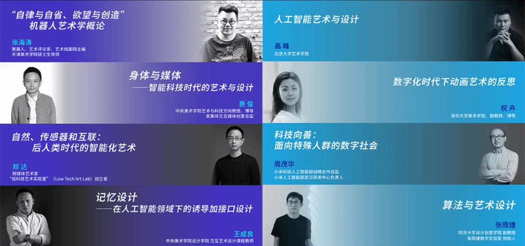 主题演讲环节,艺术评论家、天津美术学院硕士生导师张海涛以《“自律与自省、欲望与创造”——机器人艺术学概论》为题,强调机器人艺术可以理解为一种艺术媒介本体之外的观念延展。中央美术学院博士生导师费俊教授以《身体与媒体——智能科技时代的艺术与设计》为题,通过一系列的作品探讨了媒体对身体的改装、演绎、引导、延伸、互动、链接等身体与媒体之间的一系列关系。“低科技艺术实验室”创立者、我校美术学院副教授郑达以《自然、传感器和互联——后人类时代的智能化艺术》为题,讲述了将人工智能视觉识别、算法等技术灵感注入艺术作品的过程。中央美术学院设计学院王成良老师做了《记忆设计——在人工智能领域下的诱导加接口设计》演讲,指出人工智能艺术与设计所要研究的,是如何映射艺术智能的思维方法、范式和数学模型给计算智能系统。北京大学艺术学院高峰做了题为“人工智能艺术与设计”的演讲,通过自身的艺术实践经历,阐释人工智能对艺术的重新定义。清华大学美术学院副教授、博士生导师祝卉在“数字化时代下动画艺术的反思”演讲中,阐述了科技艺术视阈下,需以新的思维着眼于当代的动画人才培养。小米科技人工智能战略合作总监、小米人工智能部武汉研发中心负责人周茂华先生以“科技向善:面向特殊人群的数字社会”为题,介绍了小米科技设计的无障碍智能化的系列产品,提出用科技手段将技术输出为人文关怀回应“科技向善”的设计理念。同济大学设计创意学院副教授、张周捷数字实验室创始人张周捷在谈及“算法与艺术”时,分析了计算机作为一种纯理性的工具,代表了以计算为核心的“逻辑”思维,并强调计算机算法已成为第三种创造方式。