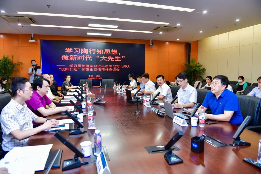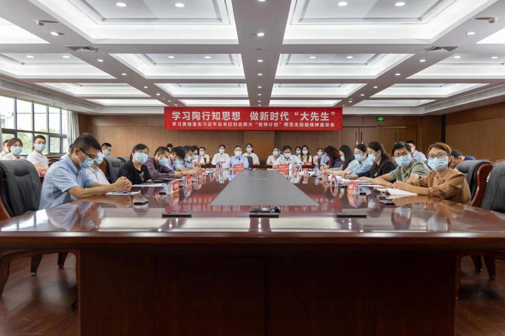座谈会由华中师范大学陶行知国际研究中心、南京大学教育研究院·陶行知教师教育学院和南京晓庄学院陶行知研究院共同主办,华中师范大学国家教育治理研究院、武汉市生活实践教育中心承办。座谈会设置多个分会场,我校“优师计划”师范生、南京大学、南京晓庄学院、汉江师范学院、贵州师范大学部分“优师计划”师范生线上参会。