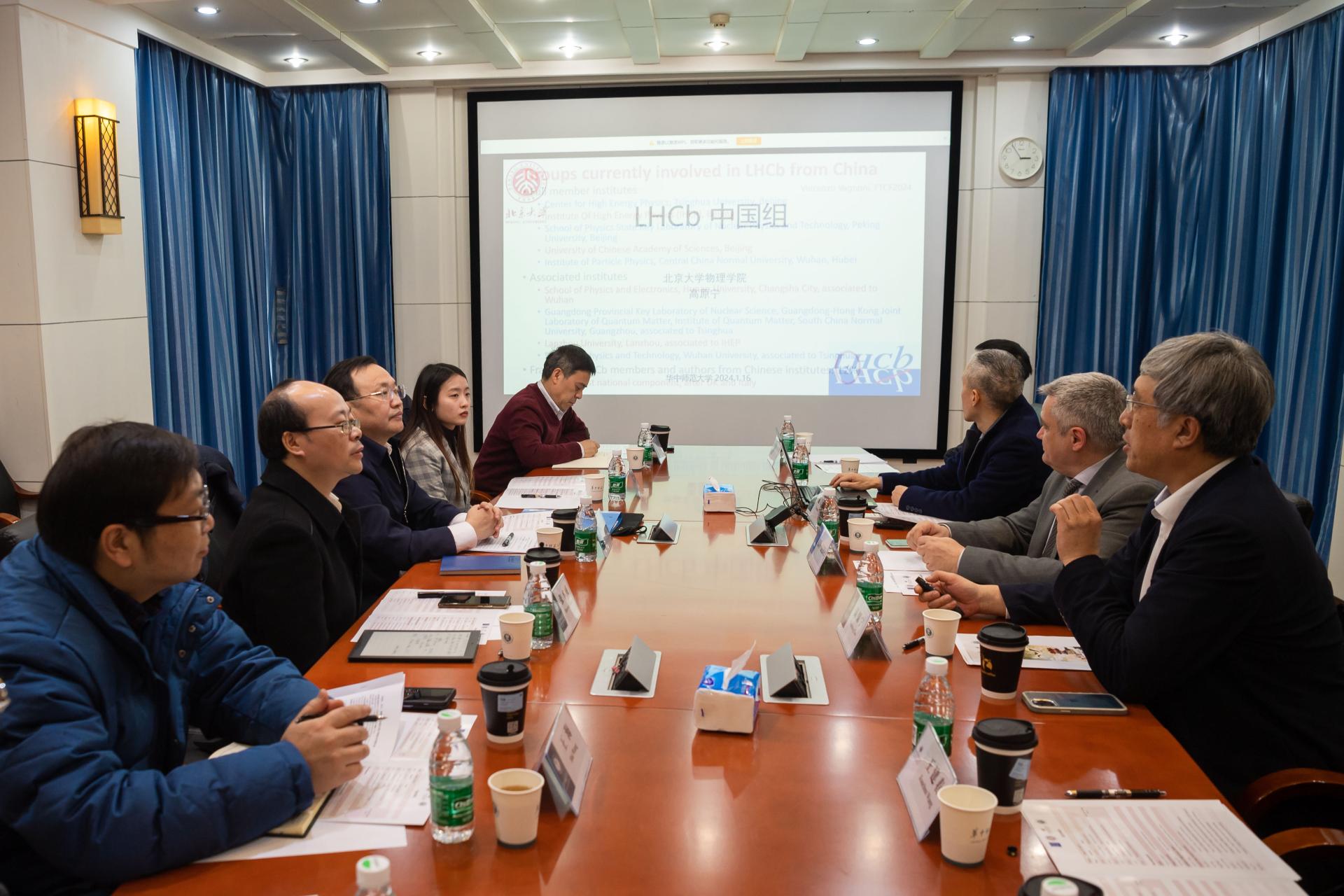 华大在线讯(通讯员 尹航)1月16日,欧洲核子研究中心—北京大学—中国科学院高能物理研究所—华中师范大学粒子物理合作会谈在校举行。欧洲核子研究中心(CERN)LHCb国际实验组发言人文森佐.瓦尼奥尼博士、北京大学物理学院院长高原宁院士、校党委书记夏立新、中国科学院高能物理研究所实验中心副主任王建春研究员出席。科技处、国际合作与交流处、物理科学与技术学院负责人和粒子物理研究所相关人员参加会谈。