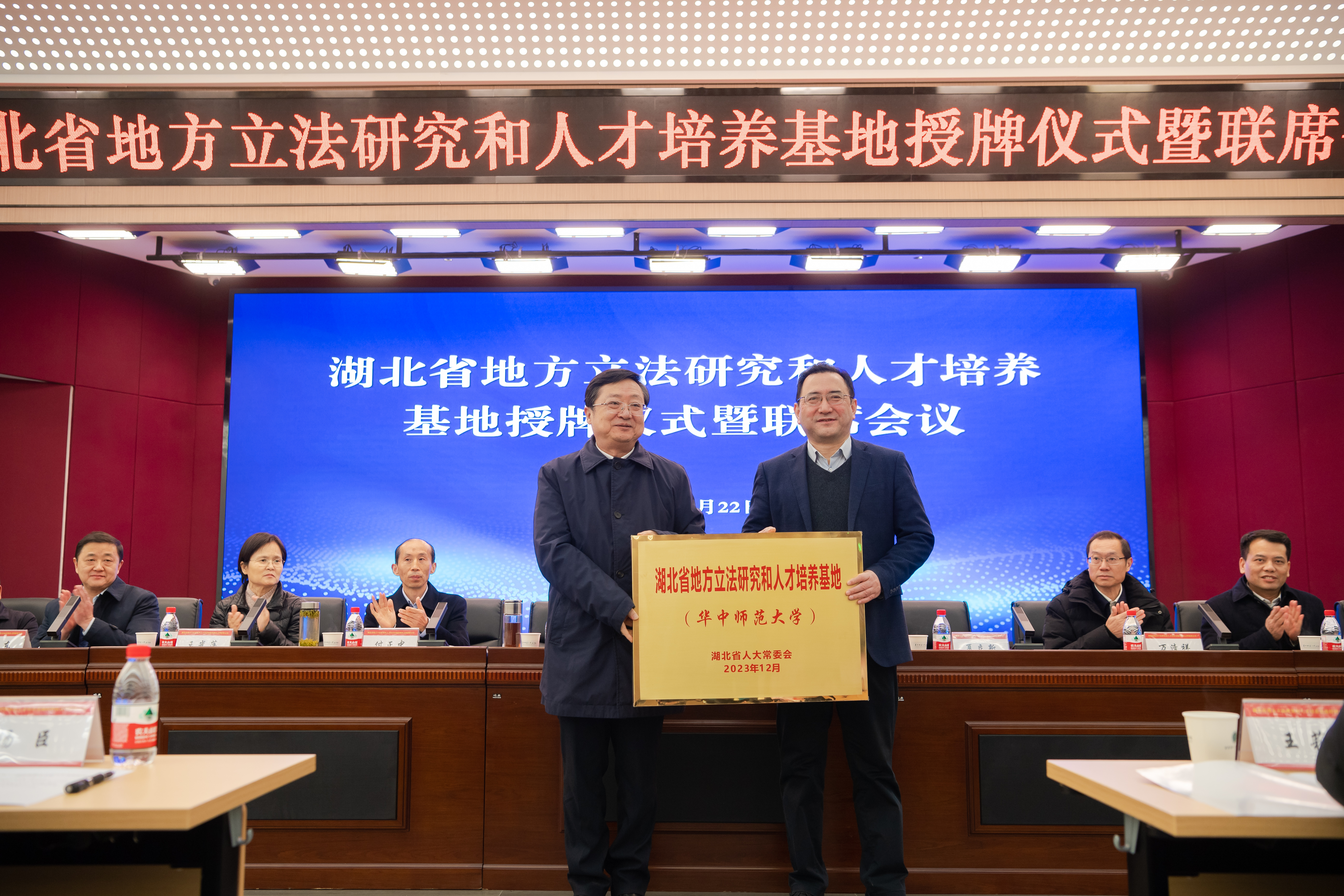 华大在线讯(记者 蒋池菲 侯希阳 卢丽鸿)12月22日,湖北省地方立法研究和人才培养基地授牌仪式暨联席会议在校召开。湖北省人大常委会党组成员、副主任胡志强,省人大常委会委员、法制委员会主任委员叶贤林,省人大常委会委员、法制委员会副主任委员、常委会法制工作委员会主任付正中,省人大常委会委员、法制委员会副主任委员、办公厅一级巡视员王光萍,校党委书记夏立新,党委副书记、纪委书记刘继文以及武汉大学、华中科技大学、中南财经政法大学、中南民族大学各基地分管领导领导和嘉宾出席会议。会议由叶贤林主持。