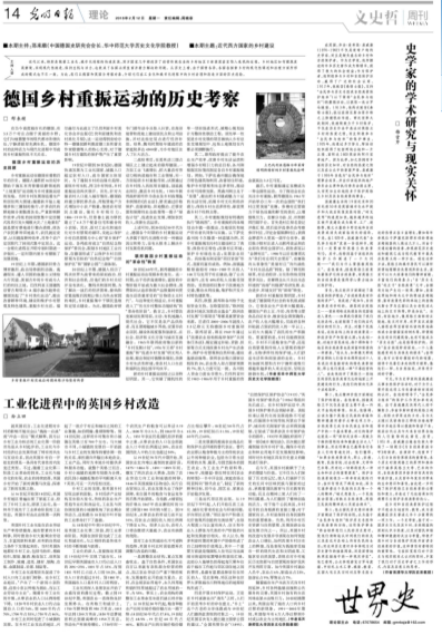 华大在线讯(通讯员 秦玉琴)历史研究应关怀现实。日前,我校邢来顺教授主持的“近代西方国家的乡村建设”主题系列文章在《光明日报》发表。该主题系列文章响应党中央国务院有关乡村振兴的战略决策,凸显世界史研究的现实关怀,从历史角度对德、英等国的乡村振兴和发展状况进行了考察,介绍它们在工业化和城市化进程中的乡村治理和改造方面的历史经验。该组文章登出被央视网、光明网、中国社会科学网、搜狐网、新浪网、东方网等各大网站转载。