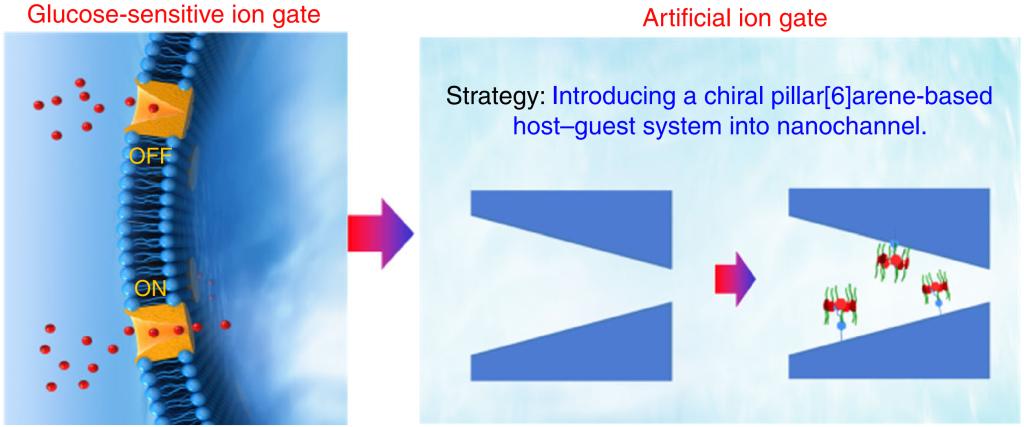 葡萄糖响应离子通道的门控行为对维持葡萄糖在人体内的平衡起着至关重要的作用。例如,葡萄糖被骨骼肌吸收以及其被排出肝脏的生理过程均涉及到该通道的开与关。研究表明,葡萄糖响应离子通道的门控行为受到外部刺激的调节。手性是生命体的基本属性,而葡萄糖正是一个手性分子。越来越多的证据表明大多数涉及分子间相互作用的生理过程受到手性的调节。那么,手性是否会影响葡萄糖响应离子通道的门控性能?构建人工离子门控模拟葡萄糖响应的离子门控,是理解这一生理过程内在机制的关键,极具必要性和挑战性。