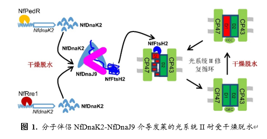 干旱影响植物的生长、发育和产量,而光合作用对干旱逆境极其敏感。发菜为国家一级保护植物,是一种分布在我国西部和西北部荒漠、半荒漠地区的陆生蓝藻,其营养细胞在野外长时间以干燥脱水的状态生存。一旦从环境中获取少量水分(雨水或露水),发菜能迅速恢复光合作用等生理代谢,抢在藻细胞再次干燥脱水之前进行短暂的生理活动。发菜是如何在干燥脱水过程中保护光合机构的呢?该课题组研究发现,分子伴侣蛋白NfDnaK2在发菜干燥脱水过程中显著上调表达,且在类囊体膜上有大量分布。深入研究发现NfDnaJ9是NfDnaK2的共伴侣蛋白,并可与光系统II核心亚基D1降解相关的蛋白水解酶NfFtsH2发生相互作用。在念珠藻PCC 7120中异源表达NfDnaK2后D1蛋白周转加快,转基因藻株对干旱、高光胁迫的耐受能力明显增强。此外,转录因子NfPedR和NfRre1可作为正向调控因子,调节NfdnaK2基因对水分环境的表达响应,从而在干燥脱水过程中保护发菜的光合机构(图1)。该研究阐明了分子伴侣系统NfDnaK2-NfDnaJ9在干旱胁迫下响应并参与修复光系统II的分子机制,为复苏植物耐旱过程中光合机构的保护机制研究提供了新思路。