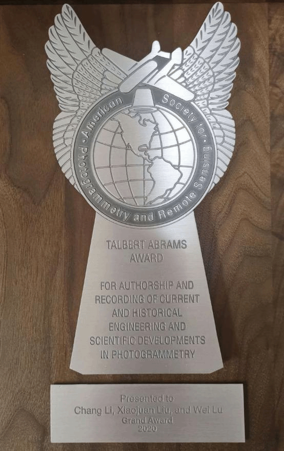 据悉,美国摄影测量与遥感学会(ASPRS)创立于1934年,为全球7000多位专业会员提供服务,该学会的宗旨是:推进地图制图科学的发展,促进摄影测量、遥感和地理信息系统技术的应用,是本领域著名的国际学术组织之一。近年来每年年会均设5类良好论文奖项,从每年刊登在ASPRS官方刊物Photogrammetric Engineering & Remote Sensing(《摄影测量工程与遥感》)上的所有论文中匿名评审产生。其中,塔尔伯特·艾布拉姆斯奖由ASPRS的杰出会员塔尔伯特·艾布拉姆斯先生(空中摄影测量之父)资助,用于奖励摄影测量学科一年中最具理论和实践意义的创新性论文,Grand Award为ASPRS年度的最高奖励、金奖。