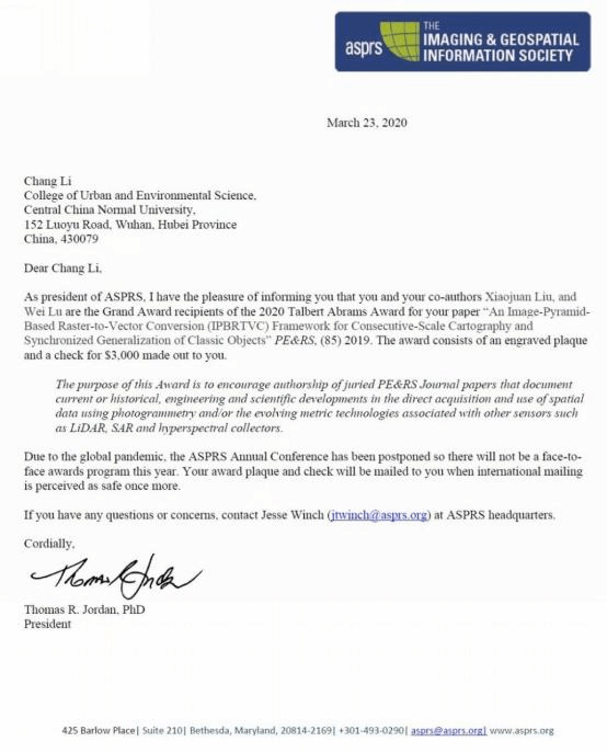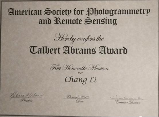 华大在线讯(记者 华轩)2020年2月28日美国摄影测量与遥感学会(ASPRS,American Society for Photogrammetry and Remote Sensing)邀请我校桂子青年学者李畅副教授于2020年3月23~25日在美国华盛顿特区参加ASPRS年会(受疫情影响,已取消今年大会),授予Talbert Abrams Award(塔尔伯特·艾布拉姆斯奖)中的特等奖(Grand Award,金奖)并奖励3000美元,这是继李畅老师获得2018年塔尔伯特·艾布拉姆斯奖一等优秀奖(First Honorable Mention)之后再次获奖,而这次获金奖(Grand Award)是该学会在摄影测量方面的年度最高荣誉(仅此一项)。