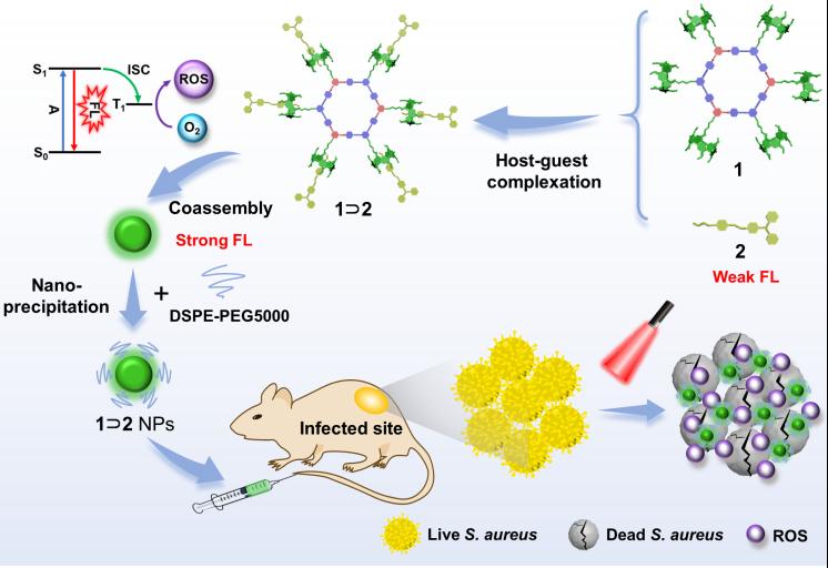 抗菌药物滥用导致了细菌耐药已经对全球公共卫生安全构成了重大威胁。设计可快速标记、精准示踪病原菌感染的荧光探针,是减少抗生素滥用和实现病原菌精准诊治的前提。现有的有机小分子荧光探针在示踪过程中往往存在自身聚集导致荧光淬灭的现象,因而极大的干扰了荧光成像检测的精准度。孙耀课题组另辟蹊径从分子调控入手,设计柱芳烃修饰的超分子大环Pt作为主体分子(1),以荧光小分子作为客体分子(2),通过其主客体相互作用构筑了新型超分子荧光探针1⊃2(图1)。