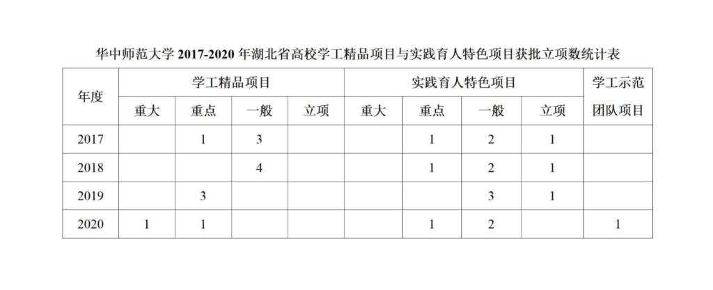 自2017年以来,我校共计获批湖北省高校学生工作精品项目和实践育人特色项目立项29项,其中学工精品项目13项、实践育人特色项目15项、学工示范团队1项。获批的13项学工精品项目中,重大项目1项、重点项目5项、一般项目7项;获批的15项实践育人特色项目中重点项目3项、一般项目9项、立项支持项目3项。学校获批立项的项目在每年湖北省高校学生工作精品项目和实践育人特色项目的结项验收中均达到合格和优秀以上等次。