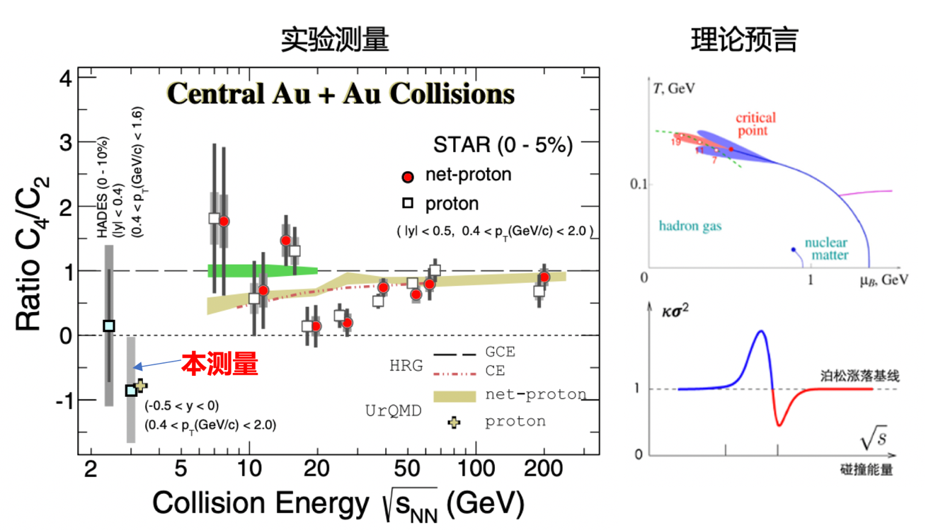 图1:左:STAR实验测量的金金0-5%对心碰撞净质子数和质子数四阶涨落的能量依赖以及输运模型计算结果。