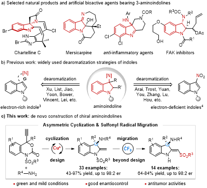 吲哚啉作为基本的结构单元广泛存在于许多具有重要生物活性的生物碱中,同时也是许多合成药物的重要药效单元。由于3-氨基吲哚啉具有显著的生物活性,化学家和药物学家为这类含氮杂环化合物的不对称催化合成提供许多有效方案,并且将这类含氮杂环化合物并用于药物发现研究。目前,发展比较成熟的策略是利用吲哚的不对称去芳构化反应合成这类含氮化合物。相较于该策略,利用不对称催化技术实现手性3-氨基吲哚啉骨架的从头构筑发展滞后。因此,寻找高效的合成策略来直接构筑结构新颖的手性3-氨基吲哚啉具有重要意义,将为发现新的、具有重要生物活性的氮杂环分子奠定物质基础。