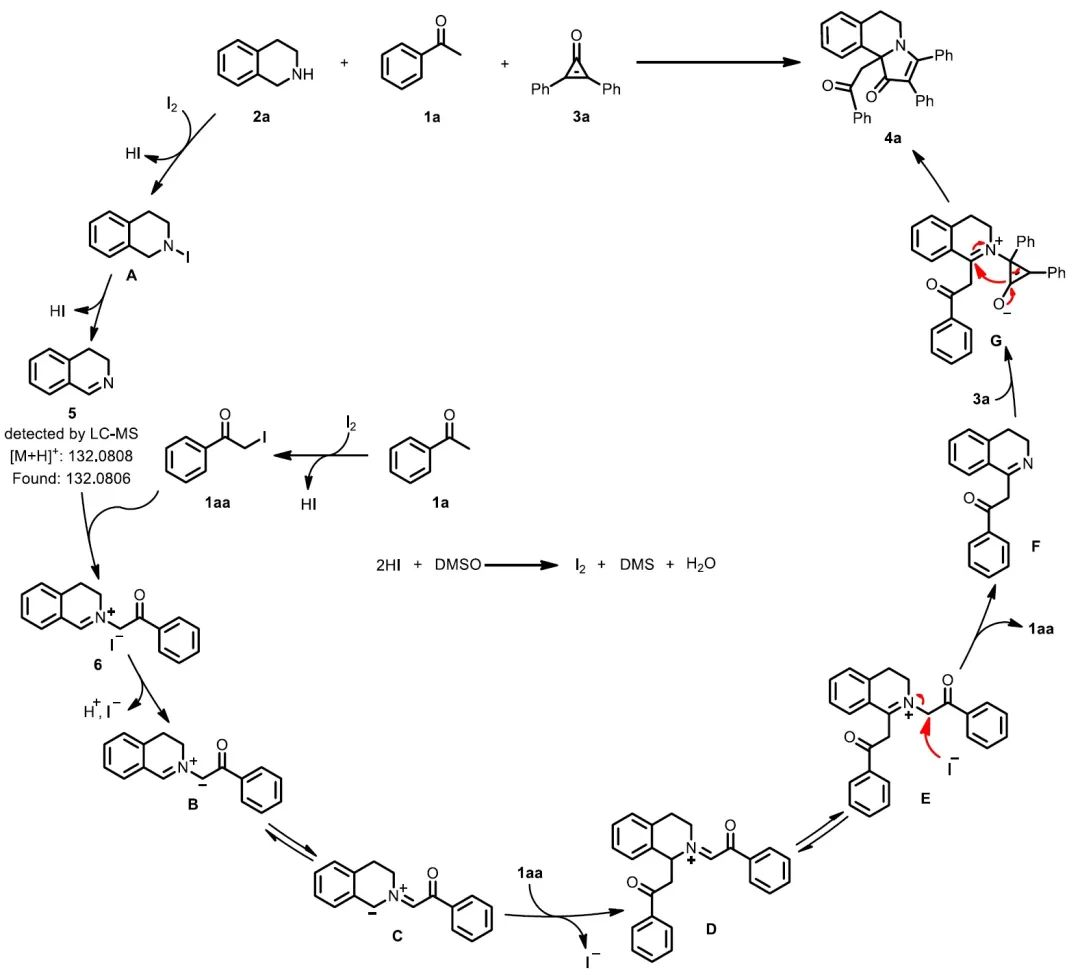 基于上述的控制实验和相关的文献报道,作者提出了可能的反应机理(图6)。首先,四氢异喹啉(2a)发生碘代过程得到中间体A,随后消去一分子HI生成亚胺中间体5。与此同时,苯乙酮(1a)经碘代生成α-碘代苯乙酮(1aa),再与亚胺中间体5反应生成亚胺离子中间体6。中间体6随后失去一个质子和一个碘负离子,得到甲亚胺叶立德中间体B并发生互变异构生成中间体C。中间体C进攻另一分子的α-碘代苯乙酮(1aa)得到中间体D。中间体D再次发生互变异构生成中间体E,并在碘负离子的作用下脱去一分子α-碘代苯乙酮,得到中间体F。中间体F亲核进攻二苯基环丙烯酮(3a)生成中间体G,最后再经历分子内环化反应生成目标化合物4a。