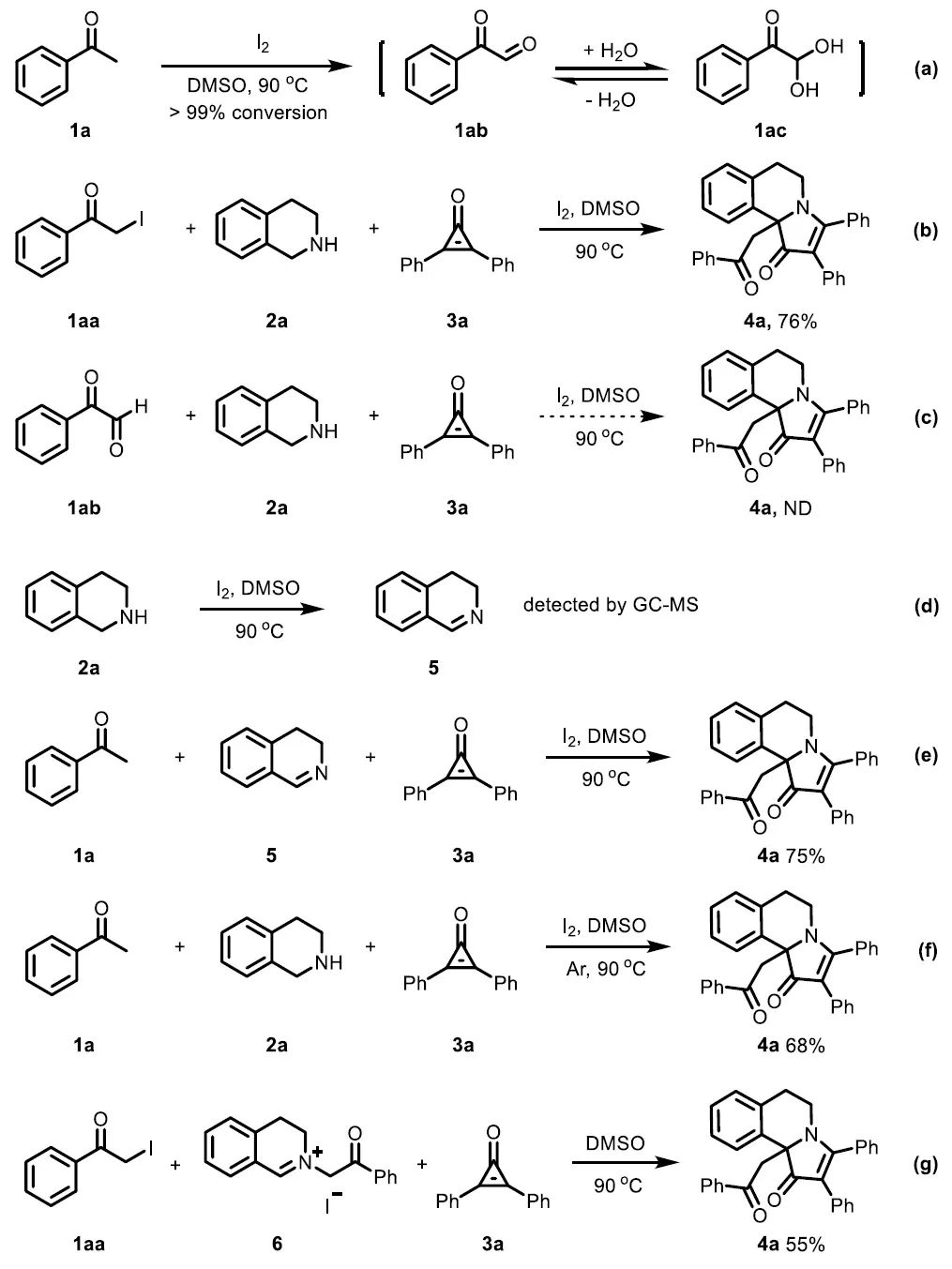 为了探究该反应可能的反应机理,作者进行了一系列的控制实验研究。在I2-DMSO介导的条件下,苯乙酮(1a)能够以定量的收率转化为芳基酮醛(1ab)及其对应的水合物(1ac)(图5a)。在标准条件下,α-碘苯乙酮(1aa)能够与四氢异喹啉(2a)、二苯基环丙烯酮(3a)反应,表明1aa可能是该反应的中间体(图5b)。然而,芳基酮醛(1ab)并不能参与这种转化(图5 c)。将2a单独置于标准条件下反应时,能够通过GC-MS检测到3,4-二氢异喹啉(5)的存在(图5d),且当选用3,4-二氢异喹啉(5)取代四氢异喹啉(2a)参与反应时,能够以75%的收率得到目标化合物4a(图5e)。以上结果表明3,4-二氢异喹啉(5)可能是反应中间体。氩气气体保护实验表明空气中的氧气可能不参与四氢异喹啉(2a)的氧化步骤(图5f)。最后,在不添加碘的情况下,化合物6能够与1aa和3a反应,进一步验证了1aa和亚胺离子6可能是反应中间体(图5g)。