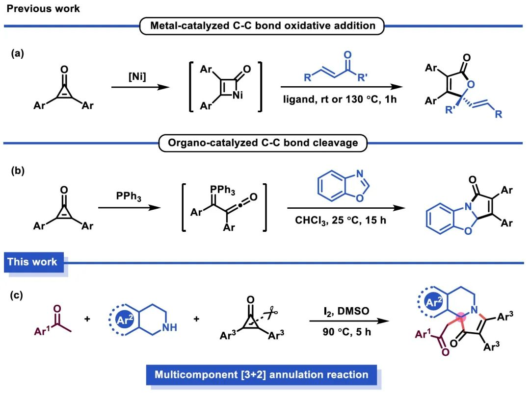 环丙烯酮作为一类已知的符合Hückel芳香性的最小单环化合物,在配体、生物合成中间体和聚合物交联剂等领域表现出广泛的应用性。由于环丙烯酮具有两亲性,在有机合成中可将其作为2C/3C合成子,发生[2+n]/[3+n]环化反应,构建多样化的杂环化合物。其中,在金属或有机催化条件下,通过环丙烯酮的C−C键断裂将其作为3C合成子参与[3+2]环加成反应得到了快速的发展。例如,2019年李兴伟教授团队报道了一例镍催化下环丙烯酮与α,β-不饱和酮/亚胺的[3+2]环化反应,合成具有高度对映选择性的γ-烯基丁烯内酯和内酰胺衍生物(图2a)。此外,Patureau教授课题组于2022年发展了一例三苯基膦催化下环丙烯酮与苯并噁唑的去芳构化[3+2]环加成反应(图2b)。发展更加温和的催化方法将进一步丰富环丙烯酮C−C键活化的应用范围,并提高其实用性和可持续性。基于此,作者在I2-DMSO介导的条件下成功实现了环丙烯酮C−C键断裂与开环并将其作为三元合成子参与[3+2]环化过程,于一锅之中构建带有季碳中心的吡咯并[2,1-a]异喹啉衍生物。该反应成功实现了1,2,3,4-四氢异喹啉的N−H/α-C(sp3)−H的三官能团化,并于一锅之中构建两个C−C键和一个C−N键(图2c)。