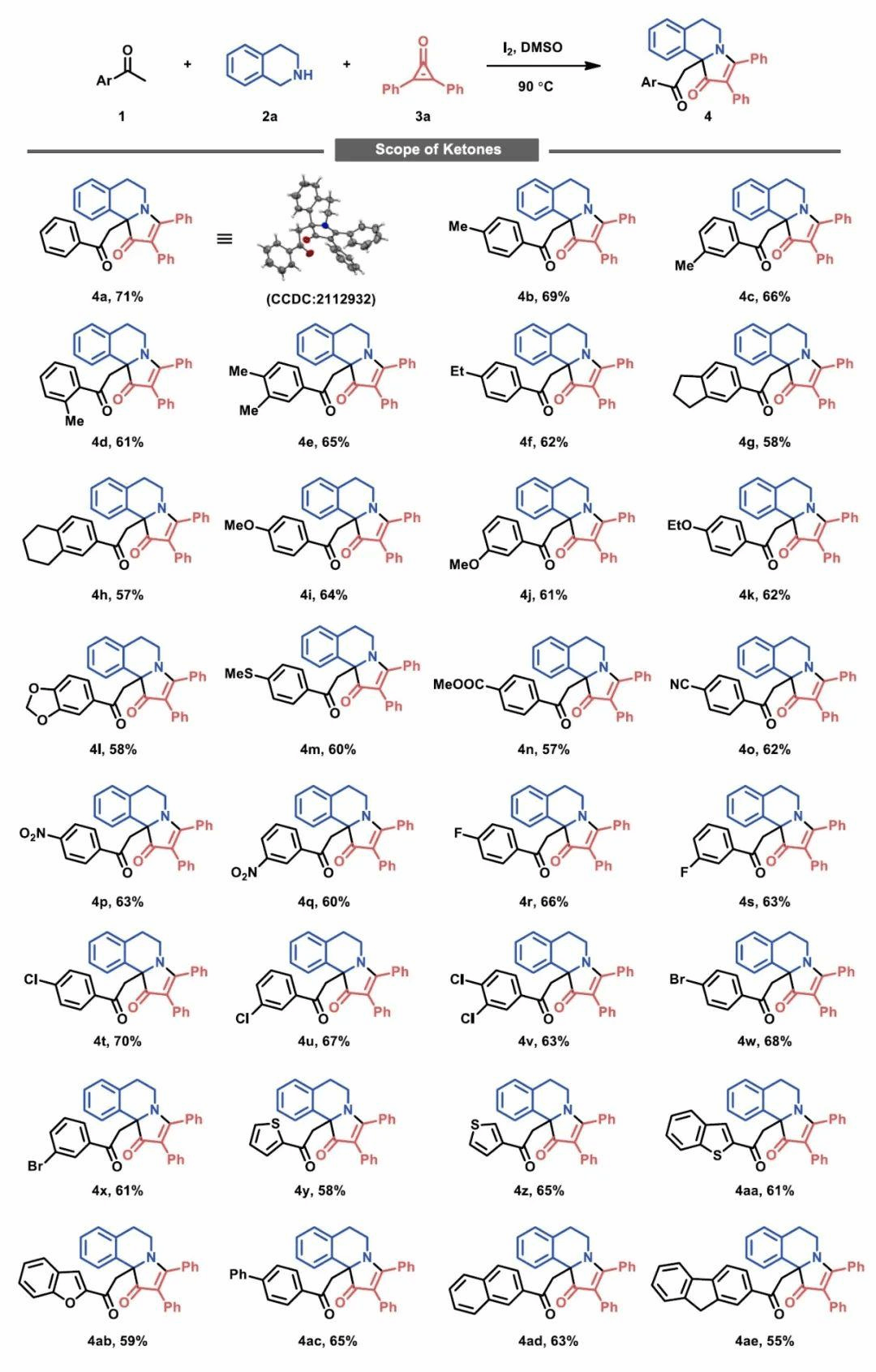 为了优化反应收率,作者以苯乙酮、四氢异喹啉和二苯基环丙烯酮作为模型底物对反应条件进行了筛选,发现在添加1.2当量碘的情况下于90 ℃的DMSO中反应5小时,能够以71%的收率得到目标产物。