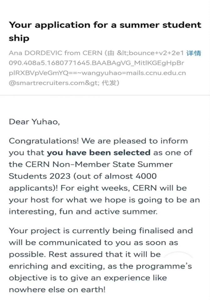 值得一提的是,物理科学与技术学院在过去20年中有多名优秀本科生入选CERN暑期学生项目,如毛亚显、彭忻烨、汤思宇、王淦蓉、徐浪等同学。