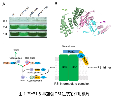 生物信息学分析表明,Ycf51在所有蓝藻和真核灰胞藻中高度保守,但在光合细菌、真核藻类(红藻、绿藻等)以及有胚植物中并不存在,暗示Ycf51为一种演化上古老的PSI组装因子。拟南芥中存在一种能与Ycf3互作的PSI组装因子Y3IP1, 但该蛋白并不能回补蓝藻Ycf51缺失的表型,这表明蓝藻PSI组装具有一定的特殊性。Ycf51是迄今所报道的首个蓝藻特有的PSI组装因子,为光系统的演化形成机制研究提供了借鉴。
