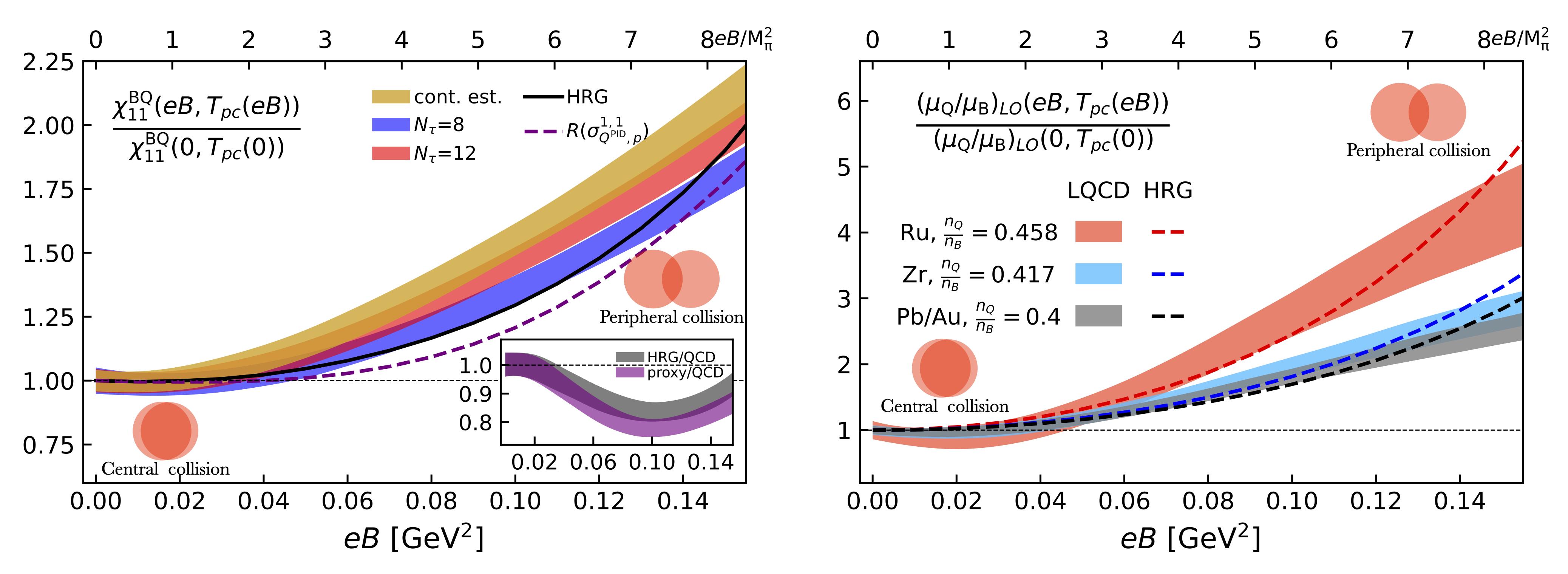 此外,通过格点QCD计算得到的电荷化学势与重子化学势之比亦对磁场变化非常敏感。该物理量与守恒荷的涨落和关联相关,在实验中可以通过将磁场强度作为额外参数,对末态强子产额进行热拟合来获取。