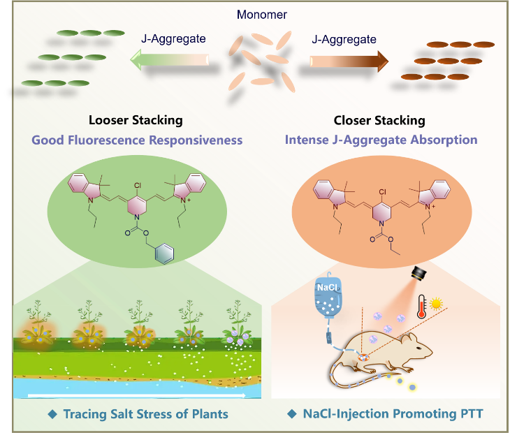 当土壤含盐量超过0.2%即会导致作物遭受盐胁迫,严重影响作物的生长和发育。该团队发现,在阴阳离子作用下,阳离子型花菁类荧光探针很容易从单体形式自组装形成聚集体,并伴随荧光强度发生显著变化。他们根据这一荧光传感机理,设计合成了一类具有近红外荧光的盐(氯化钠)响应性吲哚七甲川花菁荧光探针。该探针具有极高的荧光成像信噪比,能够完全屏蔽拟南芥叶片中叶绿素背景荧光的干扰(图1)。