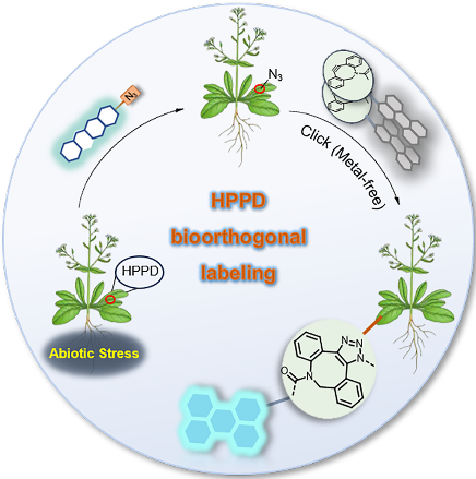 4-羟基苯基丙酮酸双加氧酶(HPPD)是一类重要的除草剂作用标靶,同时在植物非生物胁迫响应中扮演重要作用。因此,开展HPPD活体标记研究,不仅有利于阐明靶向HPPD除草剂的作用原理,而且还有利于监测植物的非生物胁迫响应。为此,该团队利用激基缔合物(荧光团从聚集体转变为单体形式)的荧光传感机理,通过生物正交反应,构建了一种荧光“Turn-on”的HPPD标记策略。环辛炔修饰的荧光团苝与叠氮修饰的HPPD配体标签在无铜催化条件下可以发生Click反应,利用这一特点,该团队成功实现了对植物活体及根尖细胞中HPPD的可视化标记,且这一无金属催化的生物正交反应过程不影响植物正常的生长和发育(图2)。同时,利用该活化标记策略,实现了在植物遭遇多种非生物胁迫(包括高温、干旱、盐、重金属、氧化胁迫等)下体内HPPD水平的动态示踪以及非生物胁迫程度的可视化评估。该活体标记策略具有很好的广谱性,可以适用于多种农作物,如辣椒、玉米等。