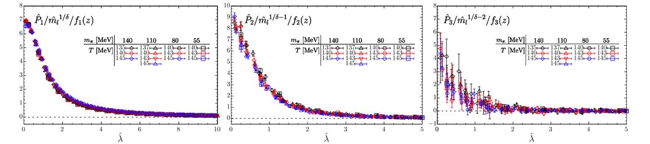 摘自文中图2:反映夸克能谱的1,2,3点关联的Pn(n=1,2,3)除以对应的O(2)标度函数和夸克质量。该图Pn表明与手征凝聚累积量具有相同的普适标度行为。