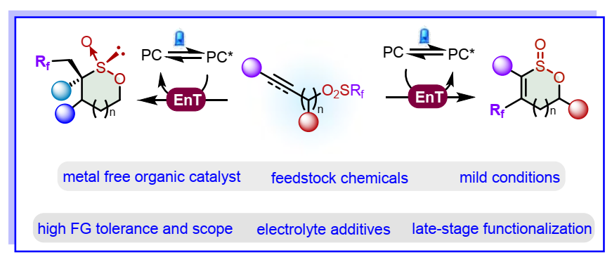 近日,舒超教授课题组进一步利用自由基串联反应实现了多环Sultine分子的高非对应选择性合成(Adv. Synth. Catal. 2023, DOI:10.1002/adsc.202300616),该类分子是一类3D类型的骨架结构,该策略是目前为数不多的可以合成多环亚磺酸内酯的途径,具有一定的研究意义。同时,该小组联合林陈晓晓课题组,宋仁杰老师和孙青老师课题组共同开发了一种能量转移赋能的sultine合成新策略,实现了廉价易得的基础化学品烯/炔基醇向高附加值亚磺酸内酯的高效转化(ACS Catalysis, 2023, DOI: 10.1021/acscatal.3c03367)上。本项研究工作是舒超课题组围绕Sultine化学取得的又一项重要研究成果,首次利用能量转移实现Sultine骨架的合成,通过计算揭示了反应选择性的根源,更新了对sultine 的传统认知,前期研究表明此类化合物是一类性能稳定可靠的电解液添加剂,有望应用于新能源材料领域。这也是首次三氟亚磺酸酯作为三氟甲基自由基前体的报道,是三氟亚磺酸钠等氟亚磺酸盐作为自由基前体的有益补充。