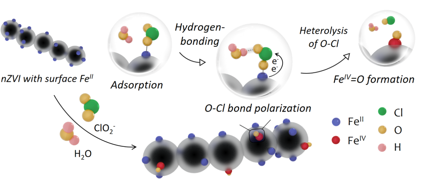 图1. 纳米零价铁与亚氯酸根选择性合成高价铁氧物种示意图