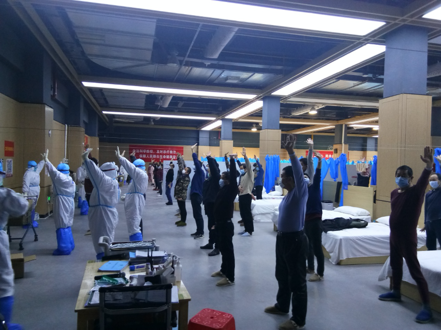 早在2月初,自己还未确诊感染之时,郝斌就向洪山区红十字会捐赠了2000元人民币用以支援疫情防控工作。入院以后,看着身边奔走忙碌的医护工作者,他既感动又心疼。在配合治疗之余,他时常会思考自己能否为防疫抗疫做些力所能及的事情,减轻工作人员的负担和压力。2月23日,武汉市委市政府发布了致全市党员干部的一封信,再一次深深触动了郝斌。刚好此时自己的身体已好转不少,于是他就行动起来,努力从点滴小事入手,帮助身边的病友共克难关。他是“外卖小哥”,协助工作人员负责病友们一日三餐的领取和发放;他是“健身教练”,充分发挥专业特长,为病友们推介和讲解华师体院“居家科学健身”系列视频作品,并带领20余位病友每日早晚做两次健身操,增强身体抵抗力;他是“心理医生”,时常通过聊天、谈心为病友们疏解焦虑情绪,鼓励大家保持乐观心态,相信党和政府,相信医护人员,奋勇拼搏、共克病魔。