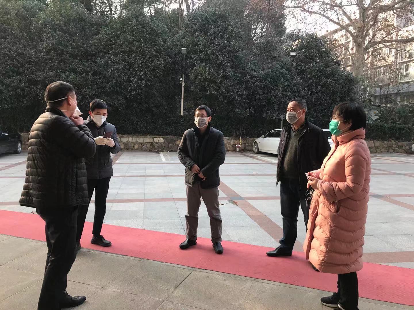 校领导商议桂苑宾馆集中隔离点建设工作。图右一为王珺