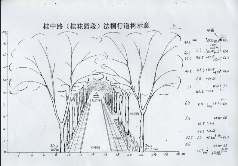 桂子山所有的树木数据收集整理完后,王敬铭就开始根据资料绘制不同种类树木的分布示意图。第一张树木分布示意图是樟树,王敬铭首先手绘一张整个桂子山地图,然后在图上标出樟树分布的位置。不同的区位,有多少株樟树,图上标注得很清楚。示意图之后附录的是文字和数字解说,樟树园1,面积5000平米,254株……。桂中路约60株,桂西路约50余株……。总数估计达2000株。然后,王敬铭还专门为大株制定了“身份证”,多高多粗,分多少大干,干径多少,确切的地点,都标注的清清楚楚。最后,又与武大或华科的大株进行比较。