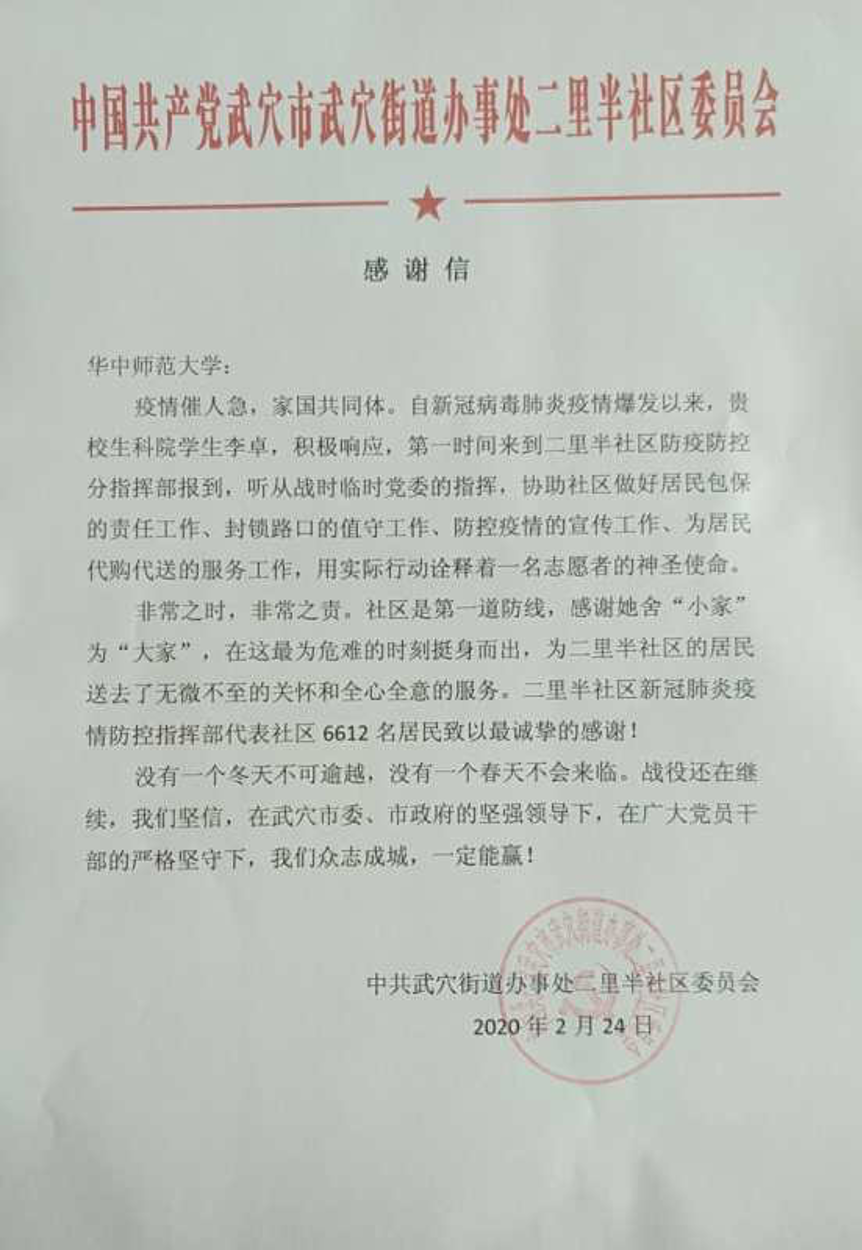 学院的收信处静静躺着一封信,这是来自中共武穴街道办事处二里半社区委员会的一封感谢信,字里行间包含的是6612名社区居民对这个00后女孩的认可和感谢。在中国特色社会主义新时代,我们需要这样的精神,期待更多年轻的声音,引领和温暖更多人,在华师,未来的种子正在成长。