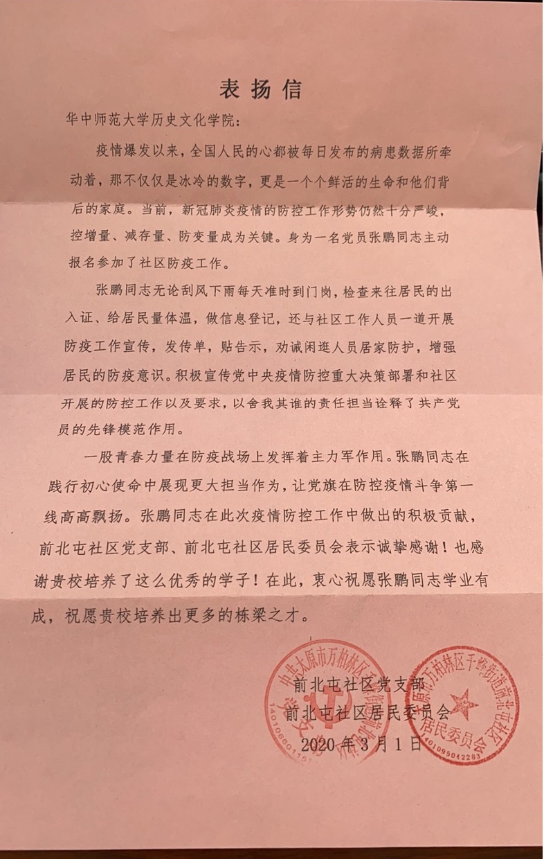 作为一名党员,面对来势汹汹的疫情,张鹏同志用自己的赤诚与热情为社区筑牢卫生长城,以实际行动践行了一名党员的初心与使命。他的表现得到了太原市万柏林区千峰街道前北屯社区居民委员会的肯定,社区居委会也主动向学校发来表扬信,感谢张鹏同志在此次疫情防疫工作中做出的积极贡献,感谢华师学子的家国情怀和大义之爱。