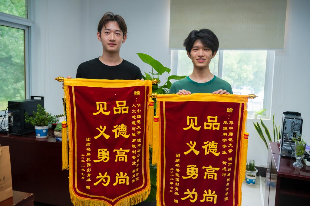 华大在线讯(记者 郝日虹)7月5日,城市与环境科学学院2019级本科生黄成坤和2020级本科生余旭鑫分别收到了写着“品德高尚 见义勇为”的锦旗。这是武汉彭婆婆和她的家人诚挚地向两位学子表示感谢,感谢他们在彭婆婆不慎落水后,不顾个人安危,挺身而出,奋勇相救。