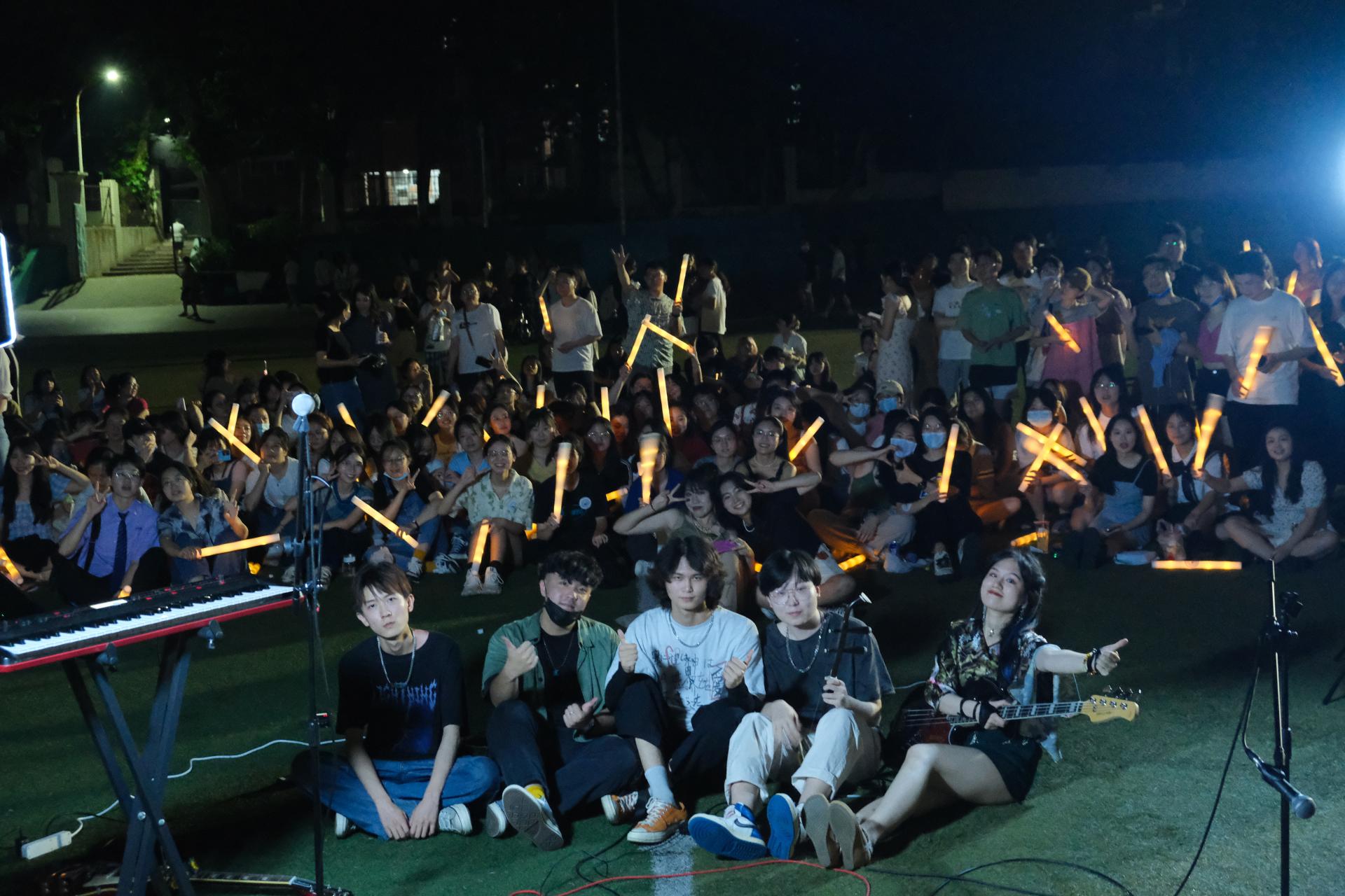 HANA乐队根植于校园,和校园内广大的音乐爱好者群体一样,在温暖团结的氛围中努力弹唱自己的音乐。来自教育学院2019级的乐队贝斯手裴一泓提到:“我们和吉他协会的其他小伙伴们每周五都会在咖啡店一起弹唱,聊音乐。”乐队成员们和同学们一样在课业中忙碌,周末的休息时间成了他们为数不多的排练时间。国交楼旁的炫指琴行是他们合作练习的地点,一间小小的排练房充满了他们追求音乐的活力。在这里练习熟练的歌曲,会在草坪音乐节或者吉他协会组织的音乐节上演出。在操场上,同学们围坐一圈,而他们在其中唱出青春的歌。