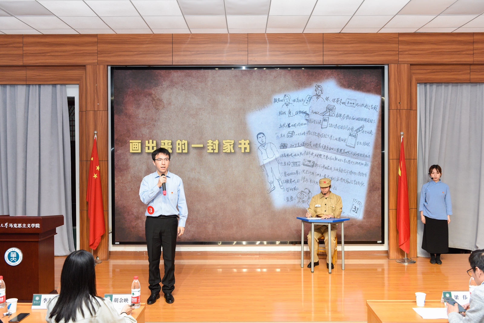 参赛选手以课堂讲授、案例讲解、情景剧穿插等形式进行展示。经评选,马克思主义学院《画出来的一封家书》《战火中的摇篮》和化学学院《殷殷之情系华夏,寸寸丹心为家国》三组作品拔得头筹,荣获一等奖。