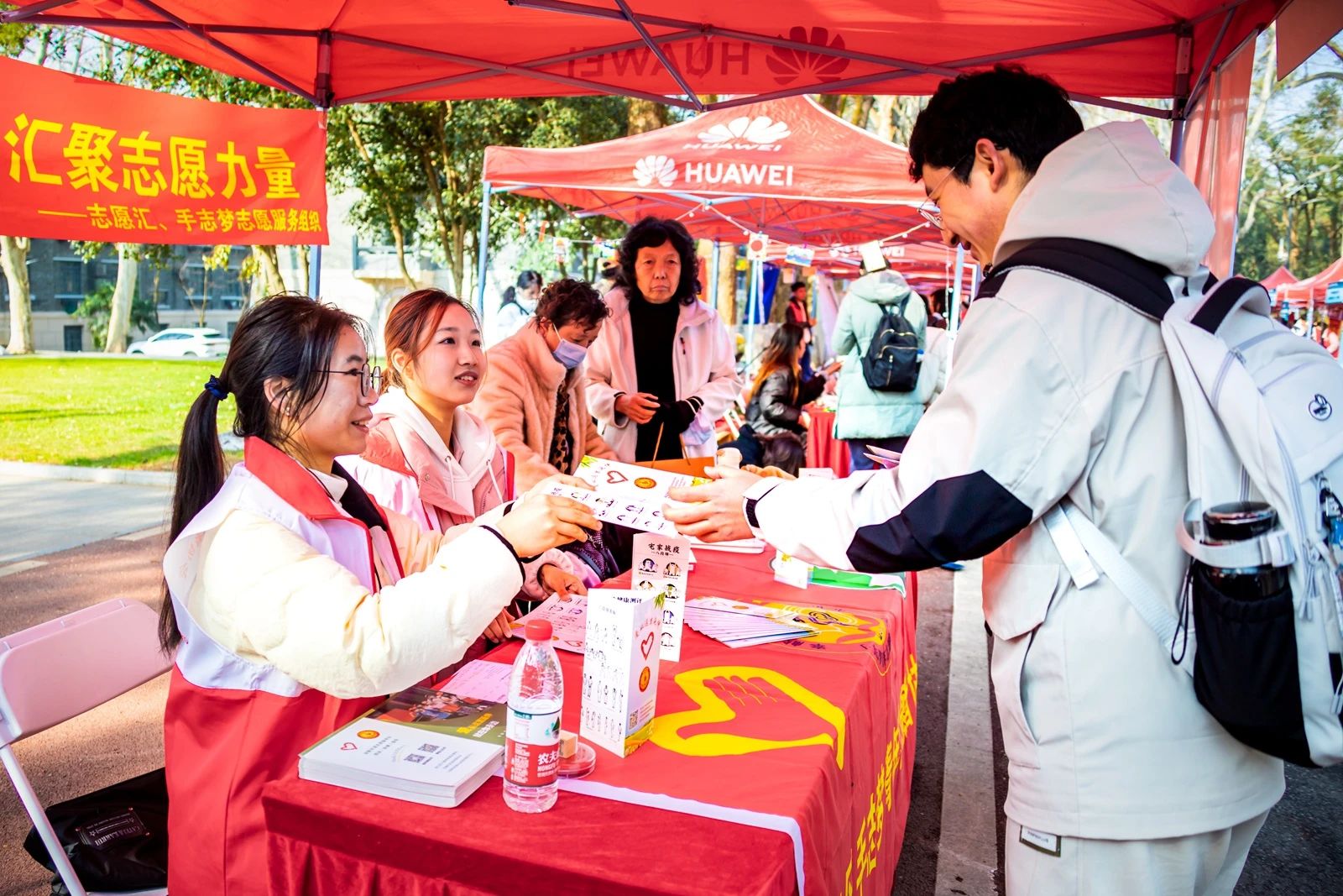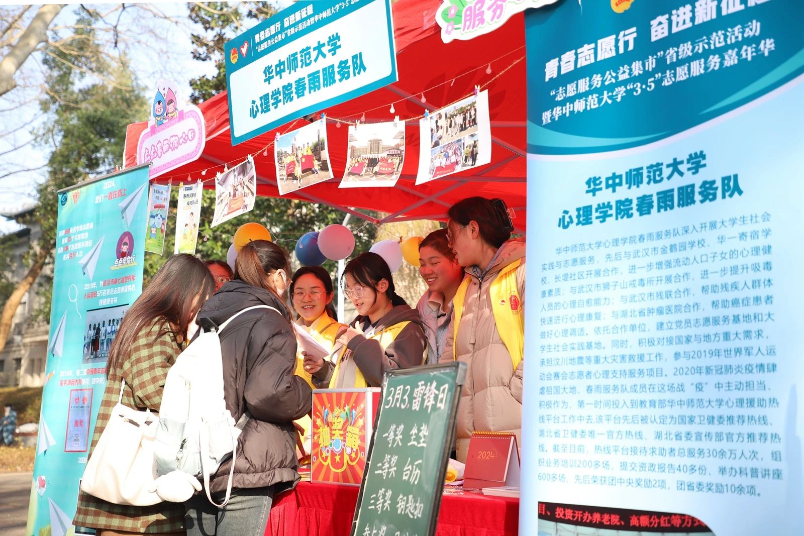 湖北省首批“本禹志愿服务示范团队”心理学院春雨服务队的摊位前人头攒动。春风化雨,润物无声。春雨服务队用心理学专业知识,为社会大众提供心理援助服务。2023级心理学院本科生童心乐说:“当我看到我们的行动为服务对象的生活带来了一些光彩之后,真心觉得自己做的事情很有意义。”