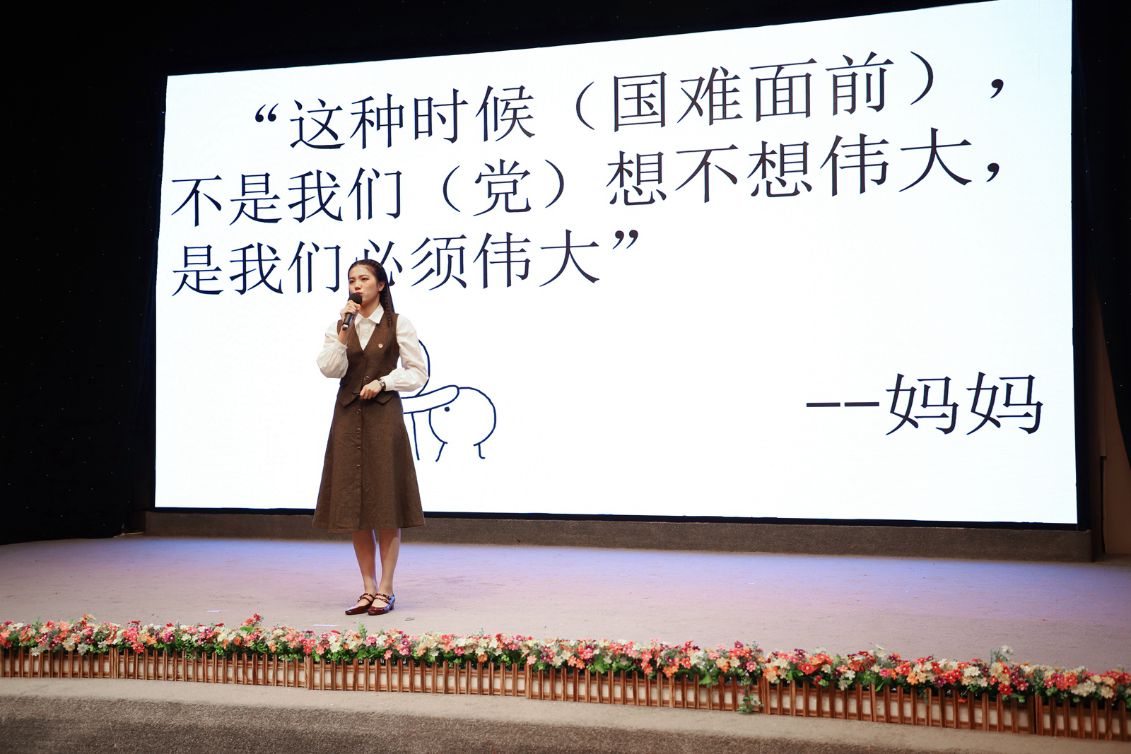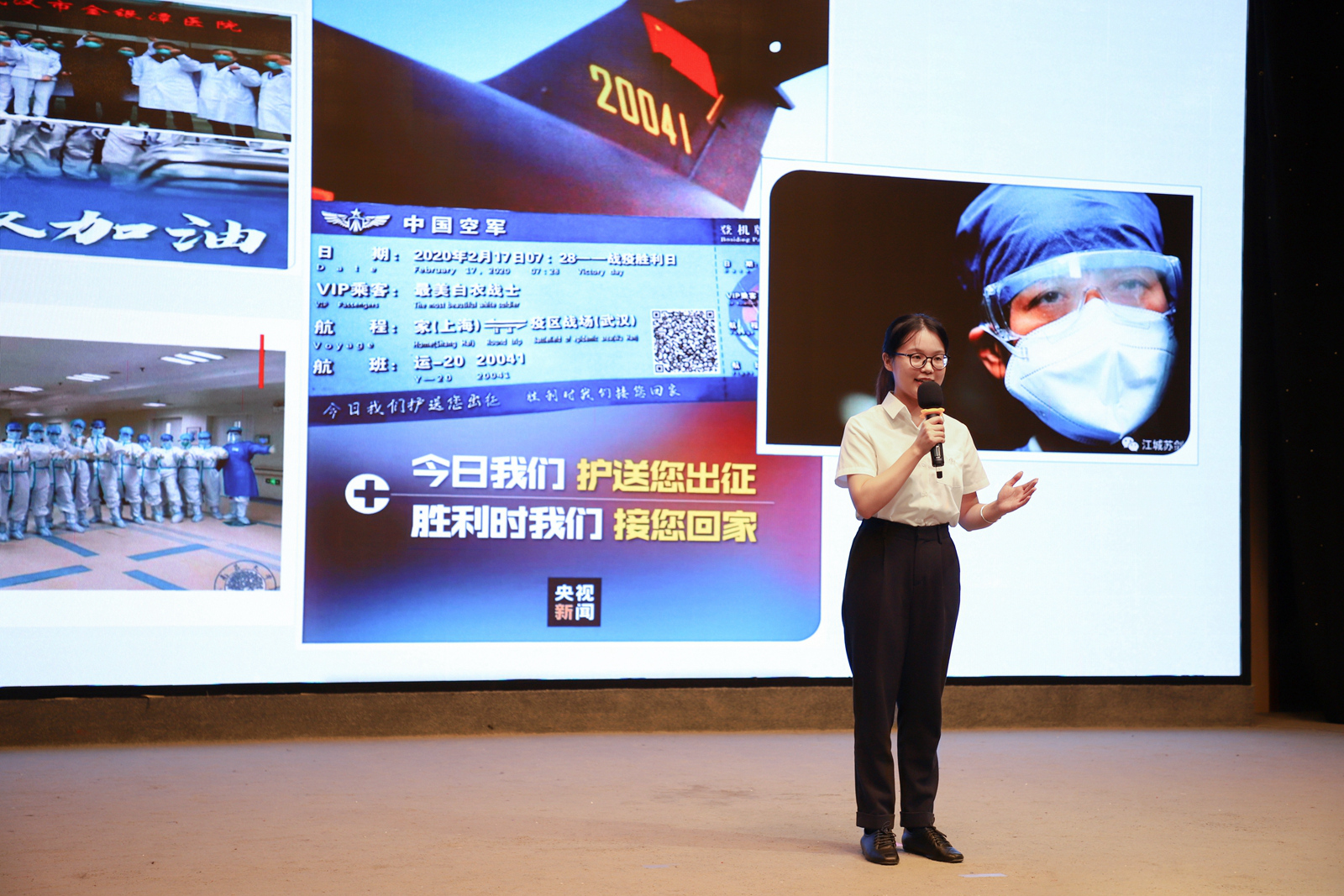 红旗一角在大屏幕上飞扬,黄鹤楼的影像闪现,史辰禹的演讲就此展开。“江山如故,黄鹤归来。”她用这八个字概括了自己对中国抗疫胜利的信心与自豪,也将中国的抗疫故事娓娓道来,展现了自己对中国抗疫行动的理解。严畅讲述了自己成为洪山区民政局一名线上志愿者的故事,以及在这之中她所看到的战疫故事。“守望相助,没有人是一座孤岛。”严畅表示,当看到大家始终以希望与感恩对待时艰,她的内心备受鼓舞。