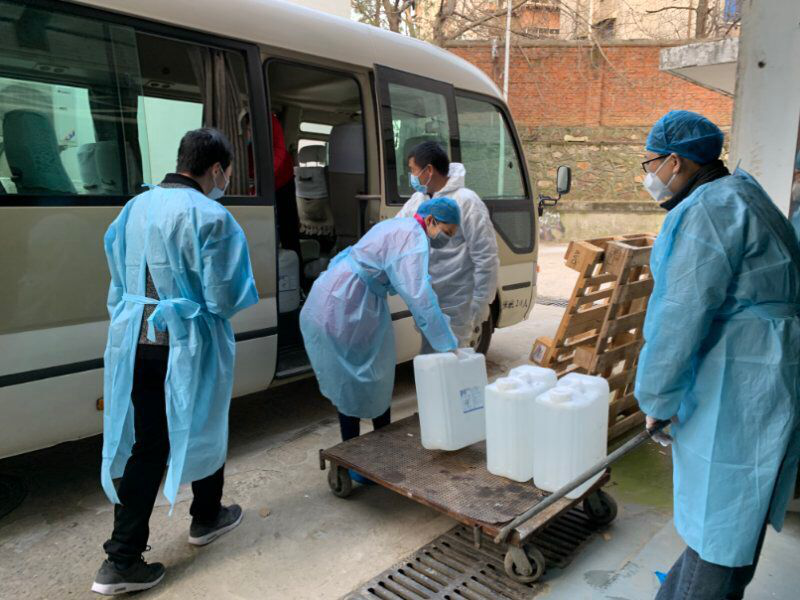 下午4点多钟,易吉林主任说河南息县给学校捐赠在物资已经到了红安。看来晚上要加班了。这时,校友孙伟捐赠的酒精到了,25升一桶,搬起来真沉啊!