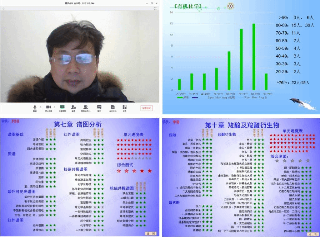 自主研发《基础有机化学自学教程》互动微课件的陈建老师将学习软件和网上授课相结合,辅助以网上多种学习资料、QQ群等。陈老师发现此款自学软件非常适合特殊时期远程教学与自学,而且每个个体可以实施个性化学习、游戏化学习,便将这款软件推广到整个年级。同时,陈老师也根据同学们针对《自学教程》提出的建议,将在后期对《自学教程》进行适当调整。经研究发现,有不少同学在软件上完成第七章学习之后,已经向老师申请学习第十章,甚至有为数不少的人完成了第十章的学习,大有“学无止境”的趋势。